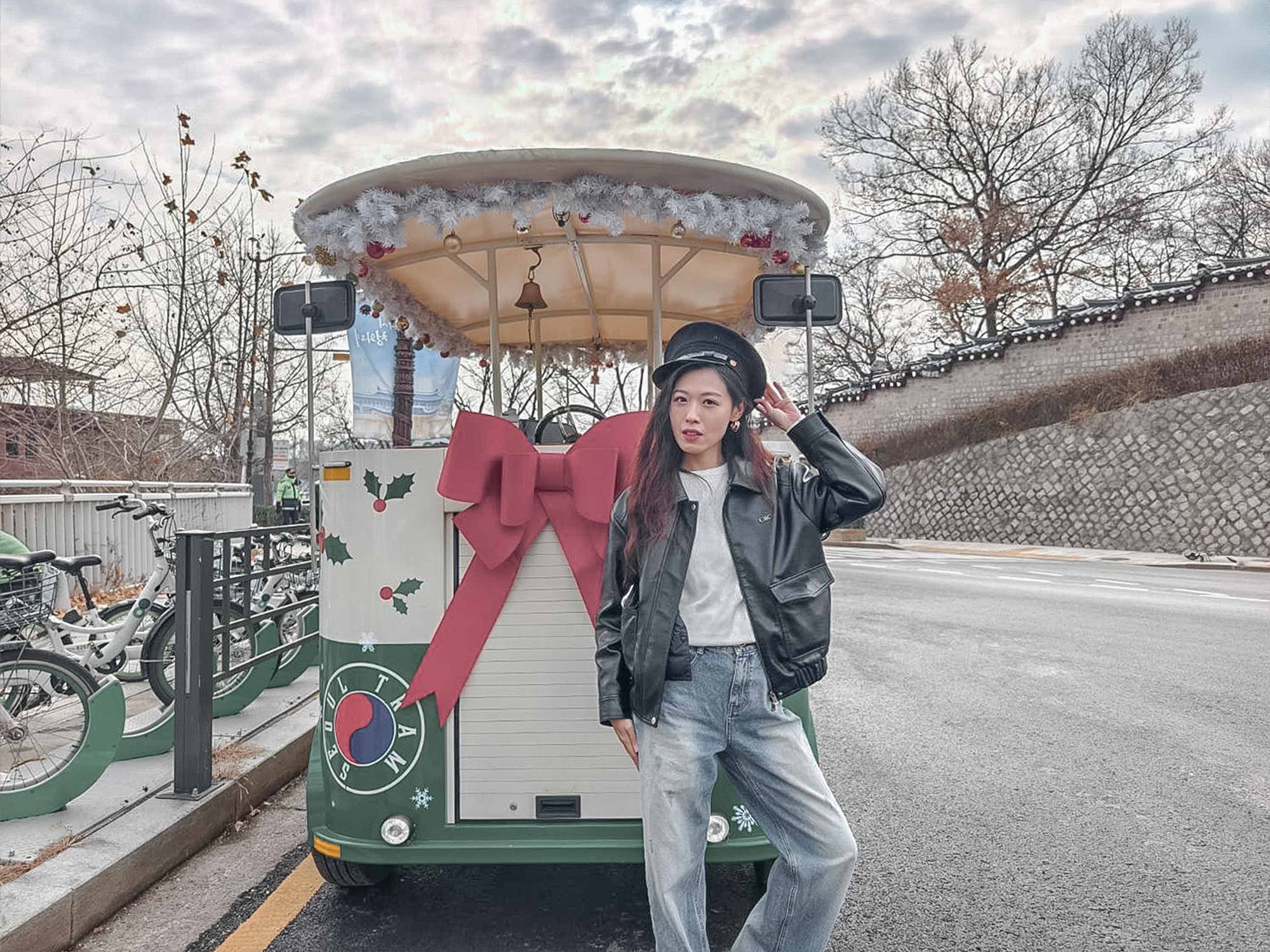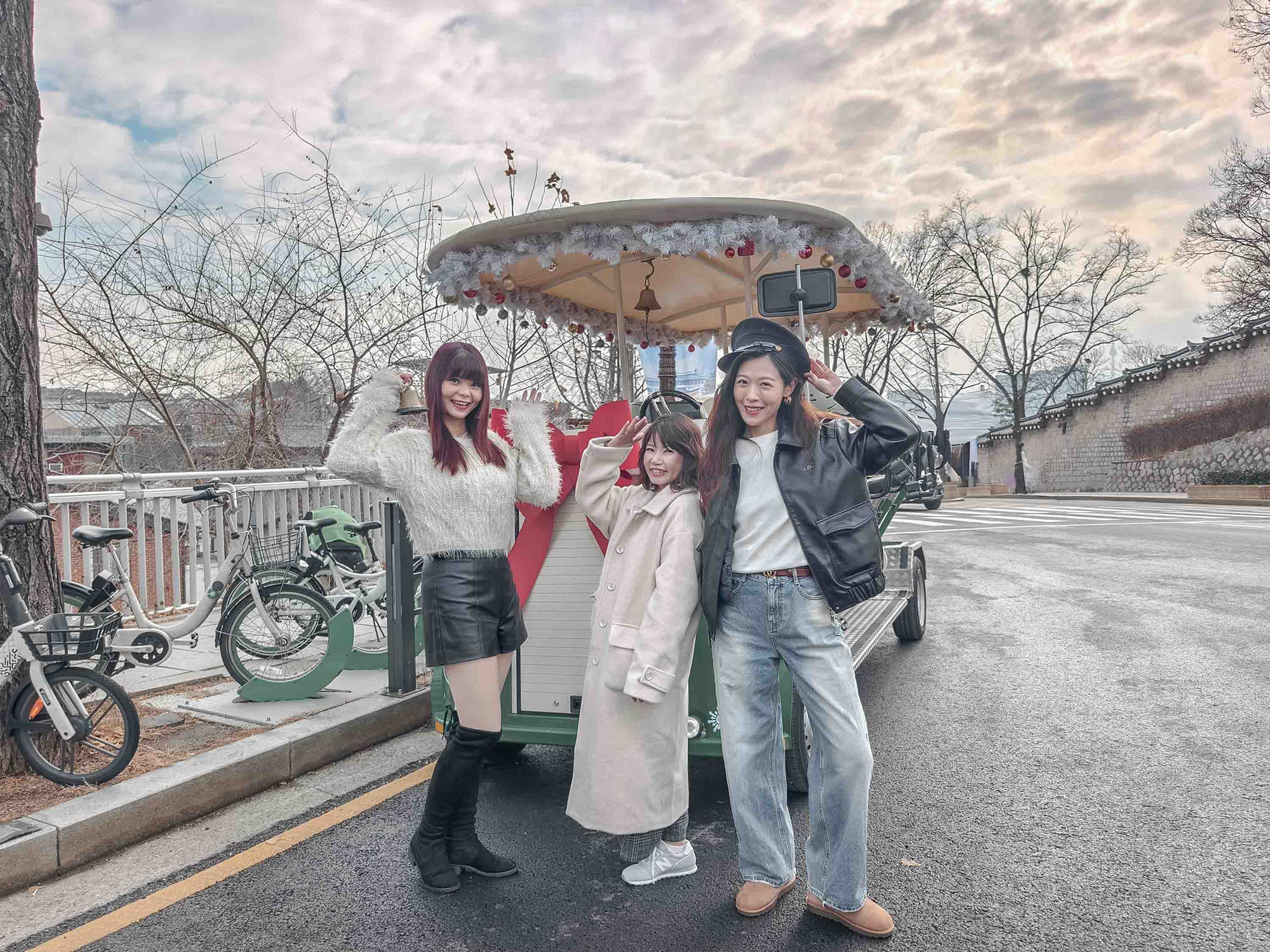 在青瓦台春秋館附近也會稍作停留,難得有機會能和復古電車好好合照。司機帽子和鈴鐺都是道具,搭配上冬日街景,隨手拍都很有紀念價值。(KKday 預約|KLOOK 預約)
