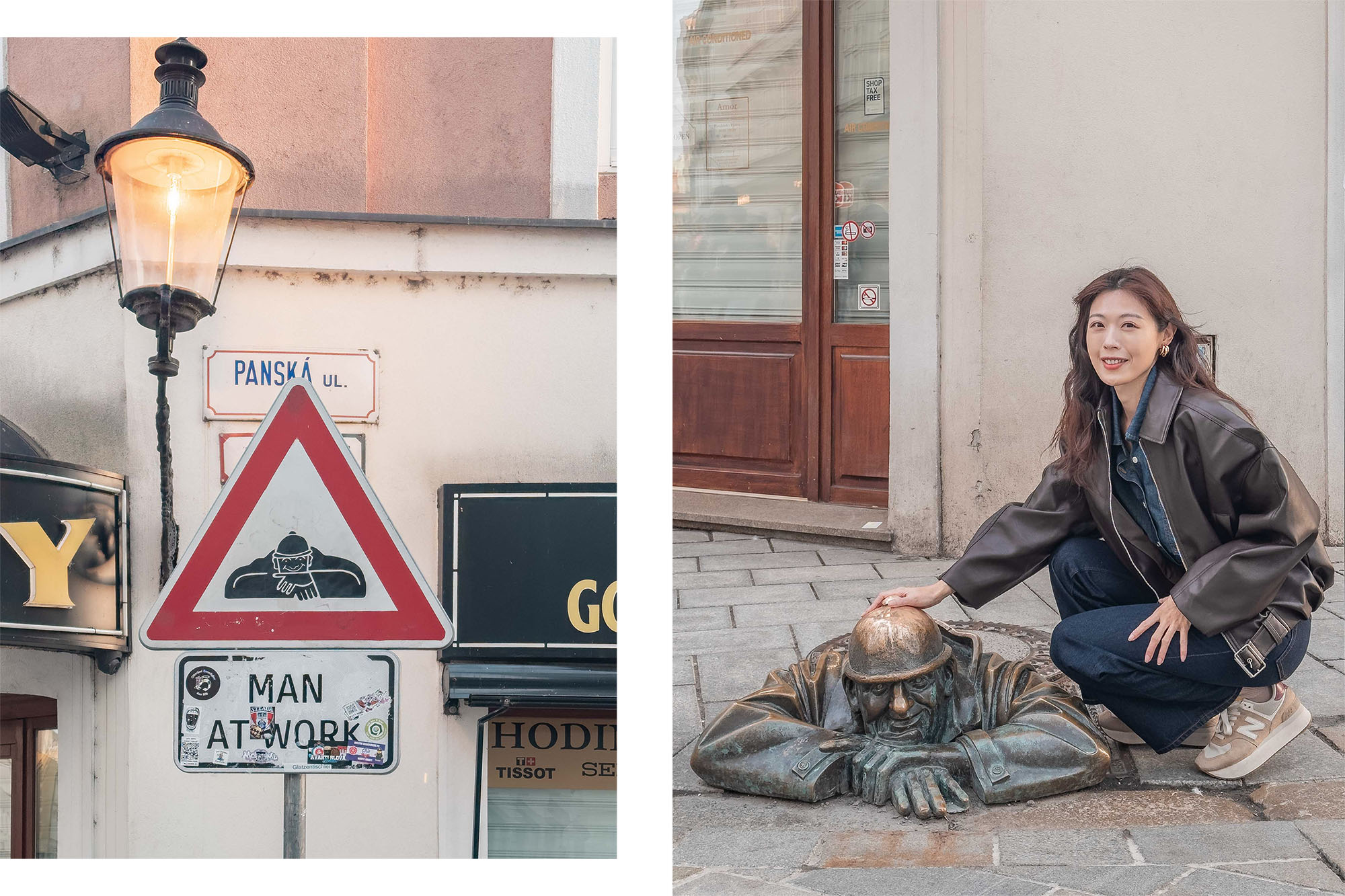 在舊城區散步還有一項隱藏版樂趣,尋找隱藏在街頭巷弄間的幽默銅像。人氣最高的絕對是從下水道探出頭的「工作中的男人(Čumil)」,據說摸摸他的頭盔會帶來好運,難怪歐洲的雕像總是被摸得亮晶晶呀!
