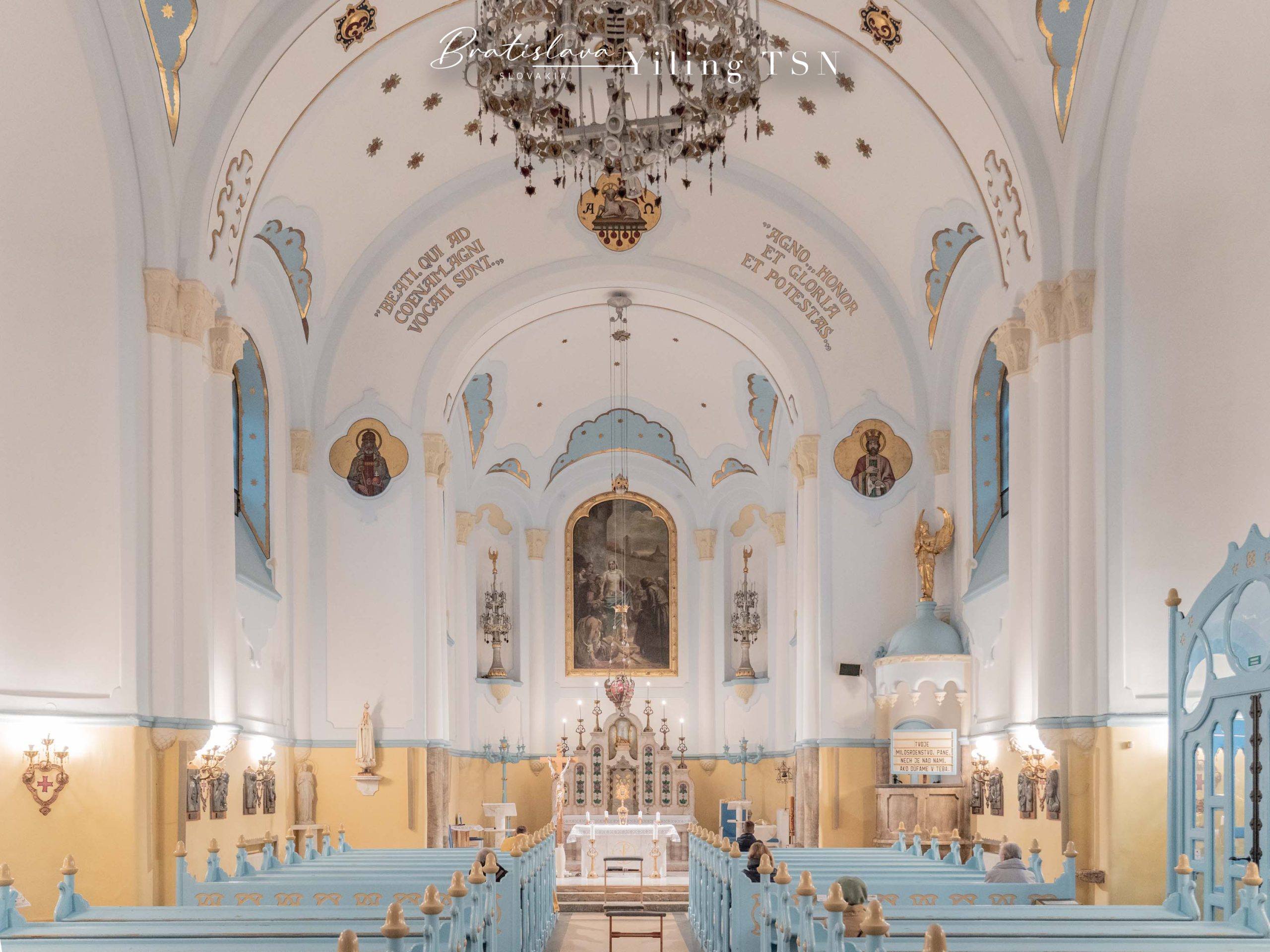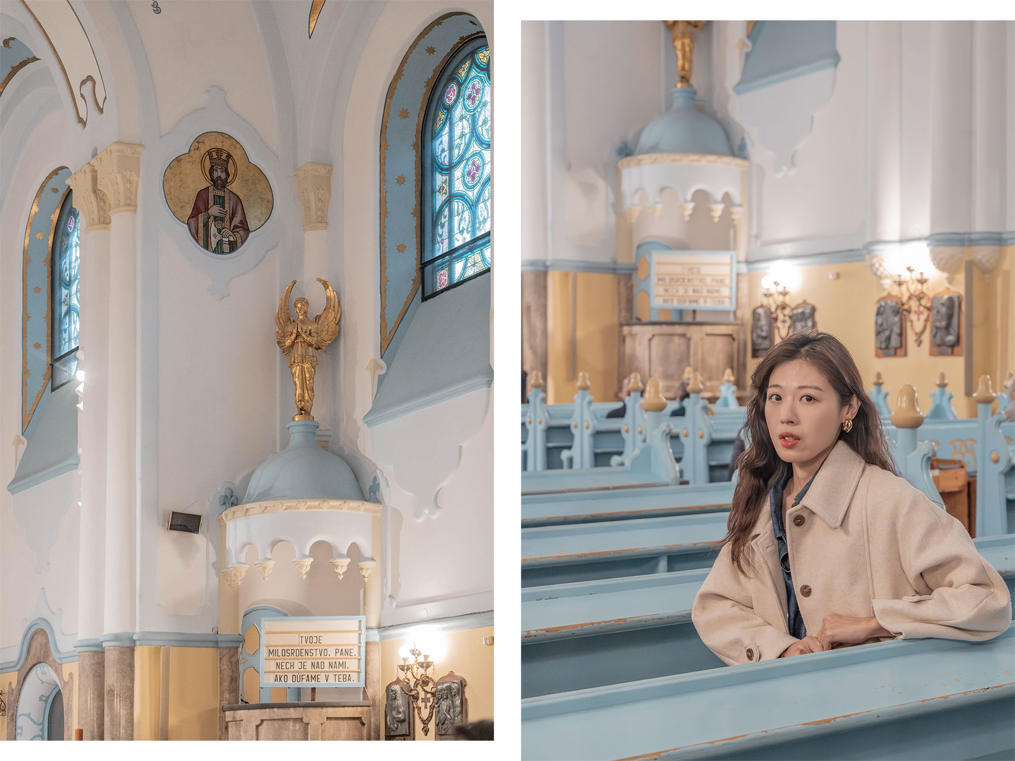 沒想到進到內部卻讓我大大尖叫,馬卡龍般淺藍和粉嫩黃交織點綴,完全沒有傳統教堂的沉重感,反而瀰漫著一股極度溫柔療癒的氛圍。