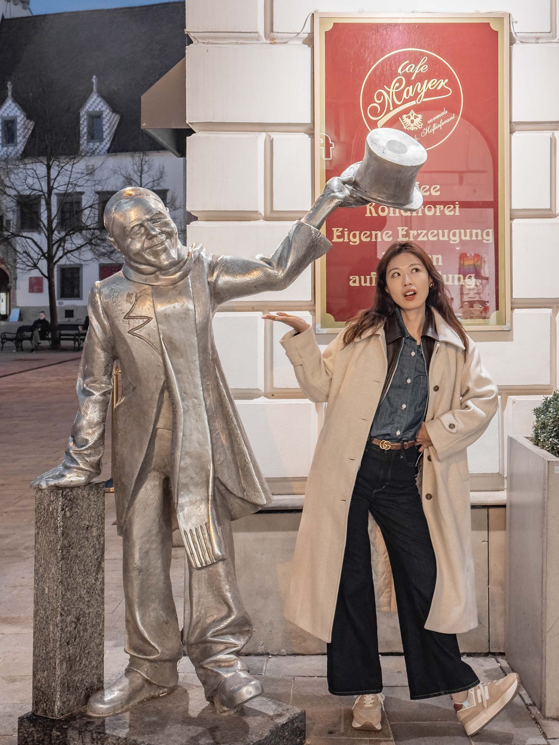 另外我們還無意間遇見了「銀色西裝紳士(Schöne Náci)」,傳說歷史上真有其人,總是穿著燕尾服,熱情像女士脫帽致意,也因為溫暖故事而被藝術家打造成等比例雕像紀念。