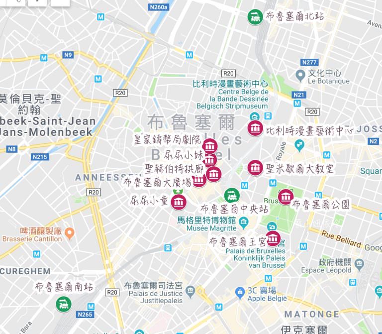 地圖上布魯塞爾大廣場是布魯塞爾很重要的地標,沿著大廣場周圍,我有標上較知名的布魯塞爾景點,例如尿尿小童、布魯塞爾王宮等,這一區域是布魯塞爾最熱鬧的區域,中央車站也位在這附近。