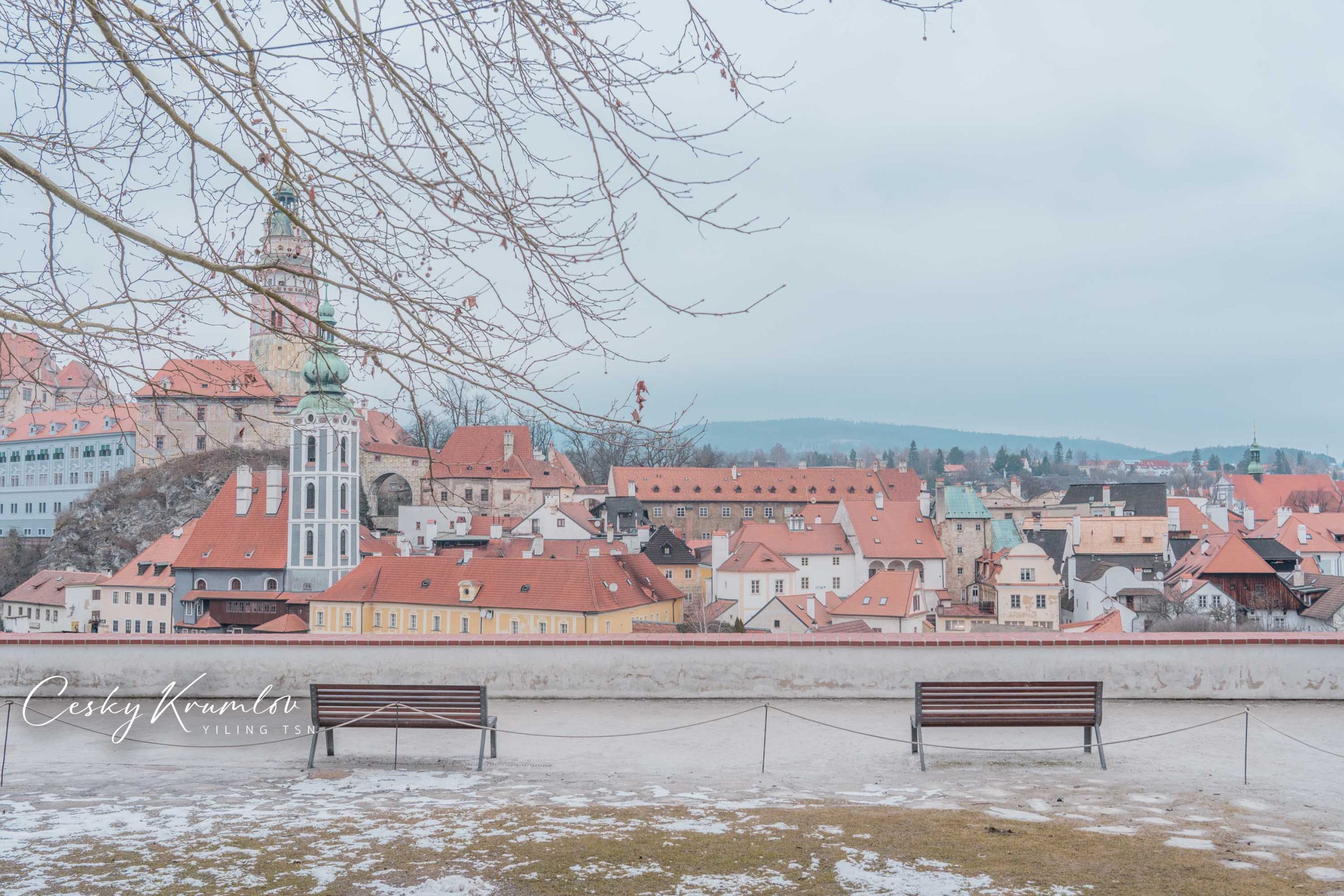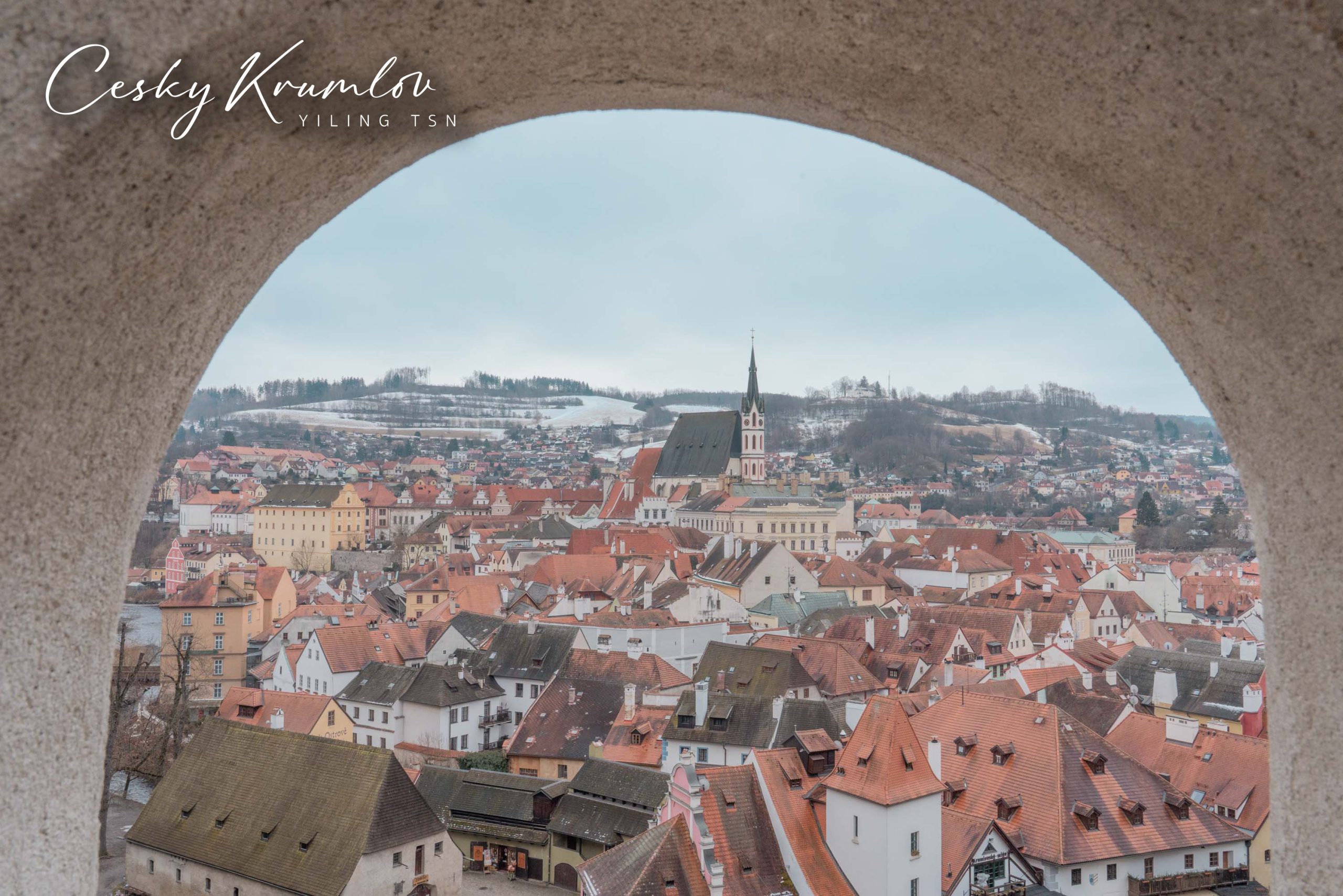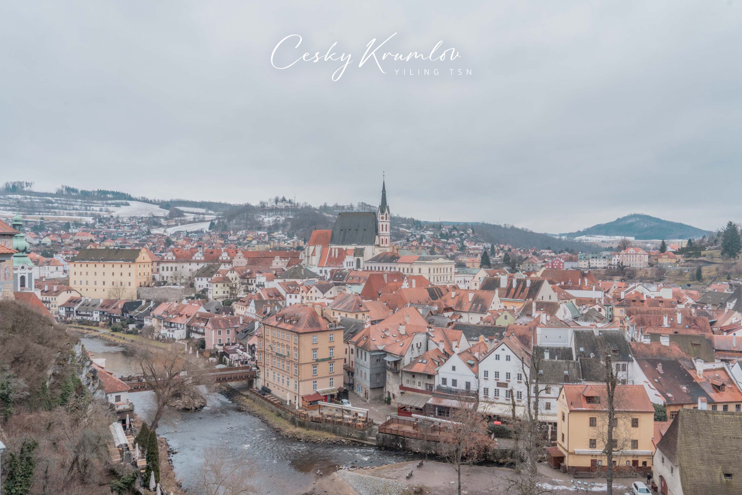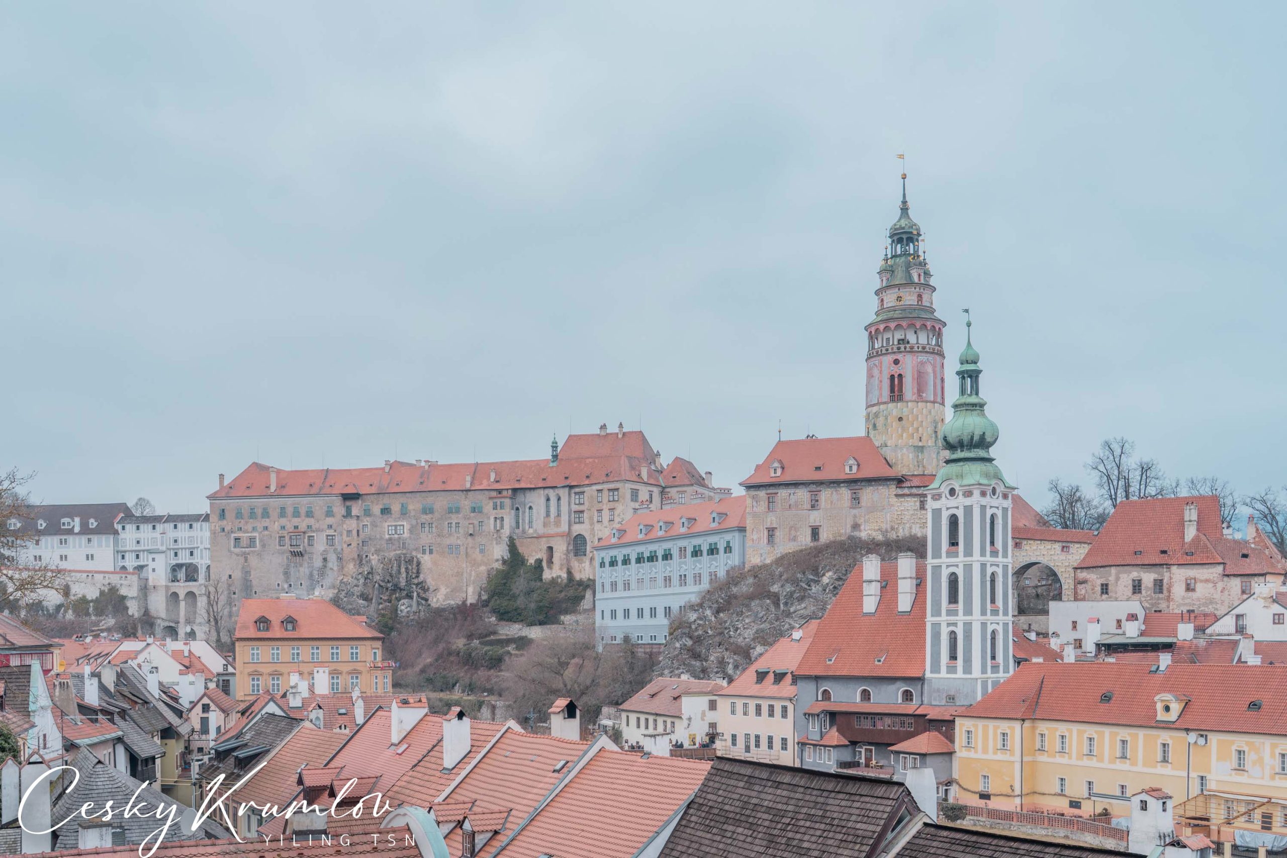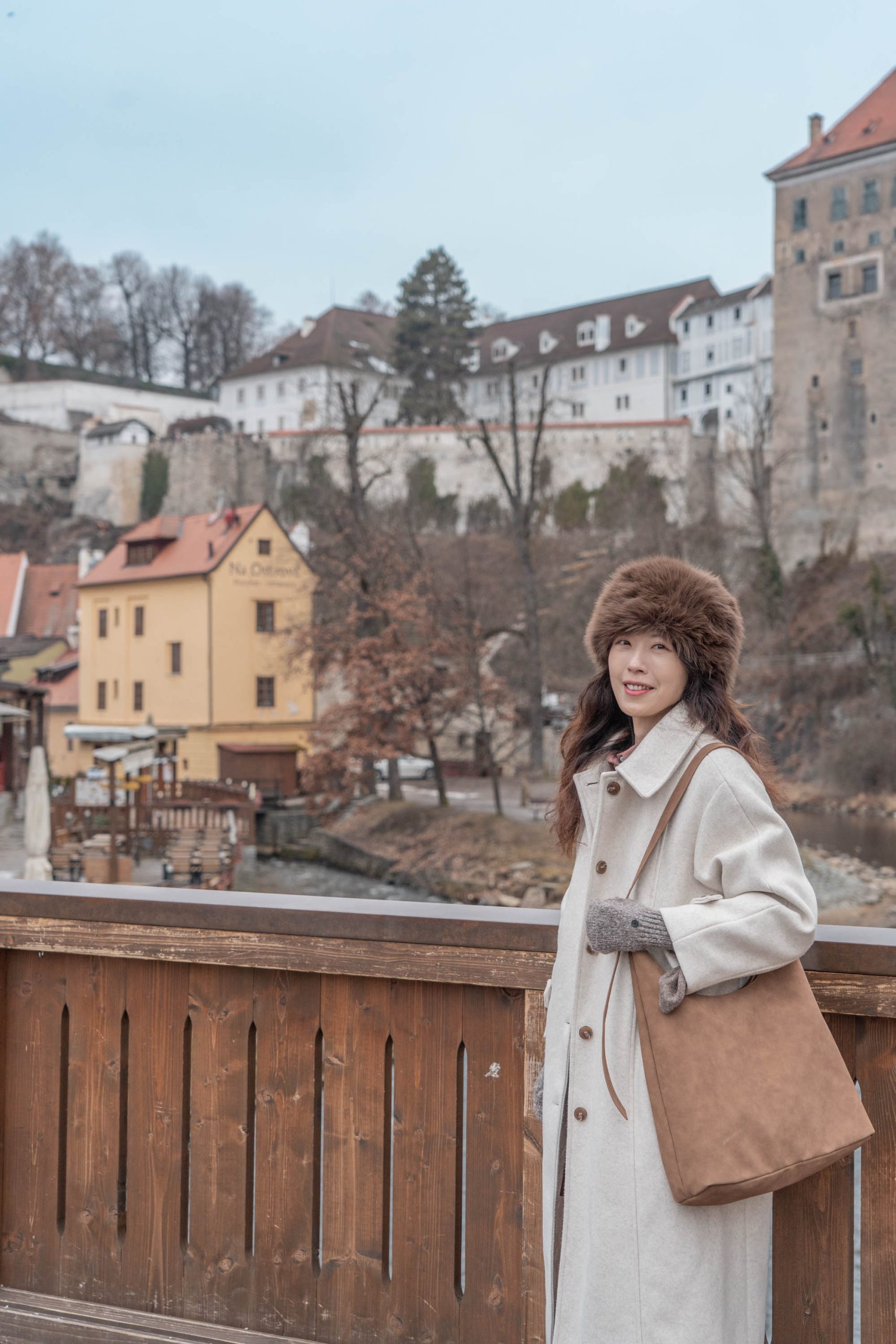 穿過橋面來到後方的觀景台,CK小鎮紅瓦屋頂、蜿蜒河流和遠處的聖維特大教堂尖塔一覽無遺,不需要講究構圖技巧,輕輕鬆鬆就能拍出滿意的人像照。