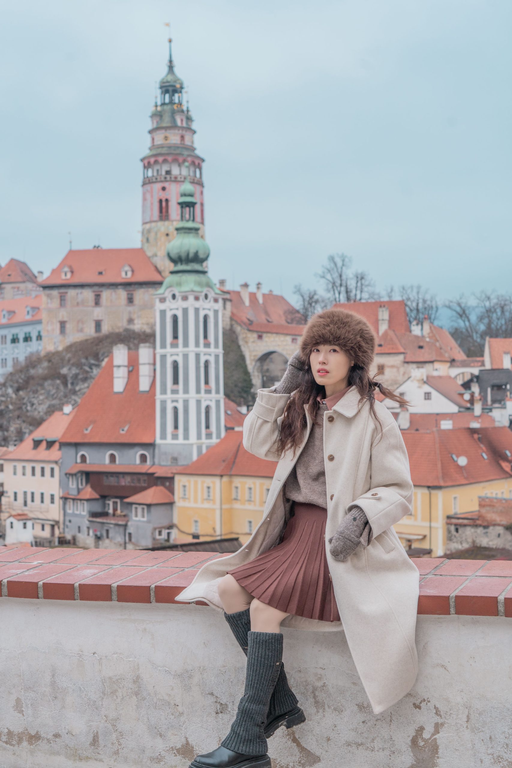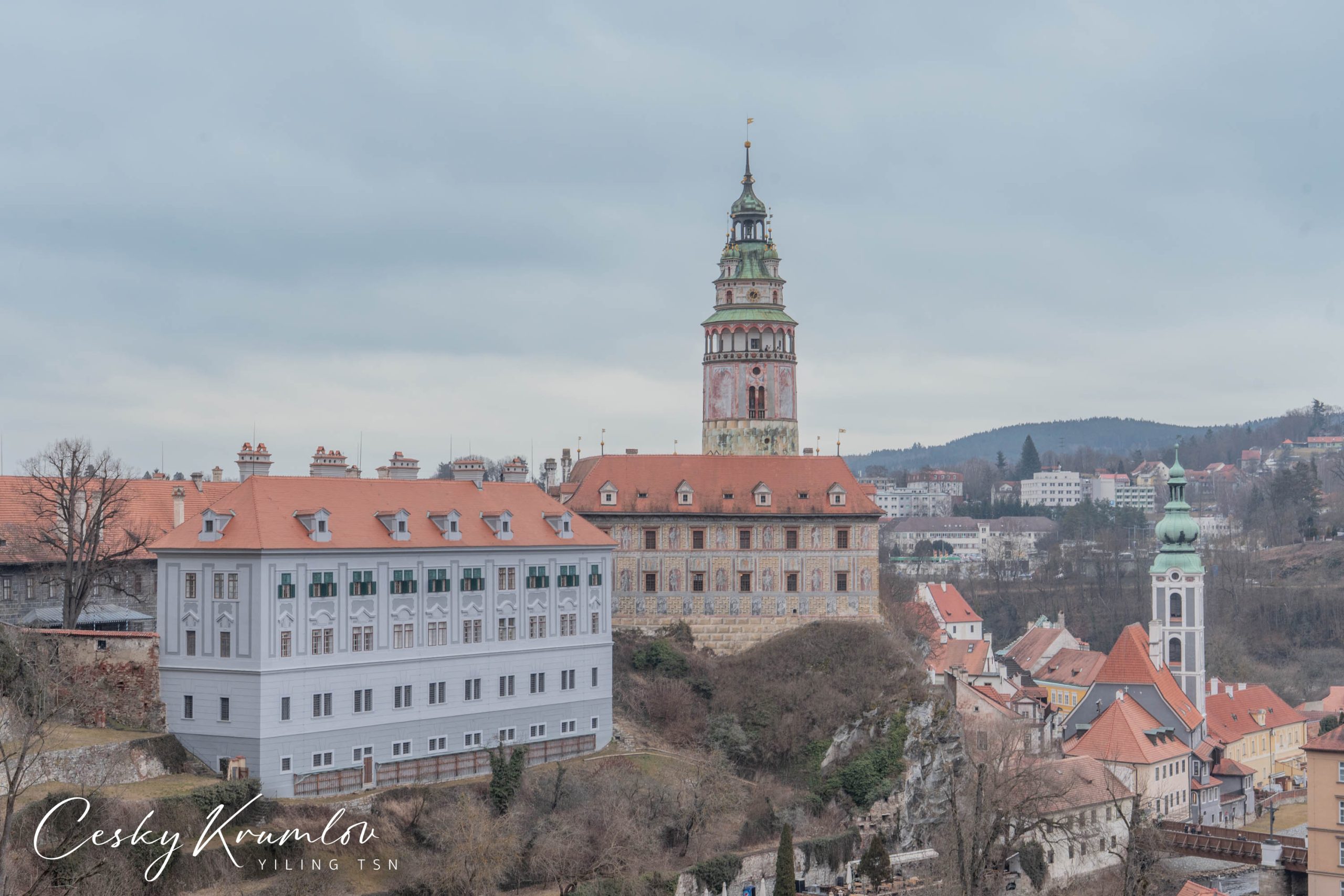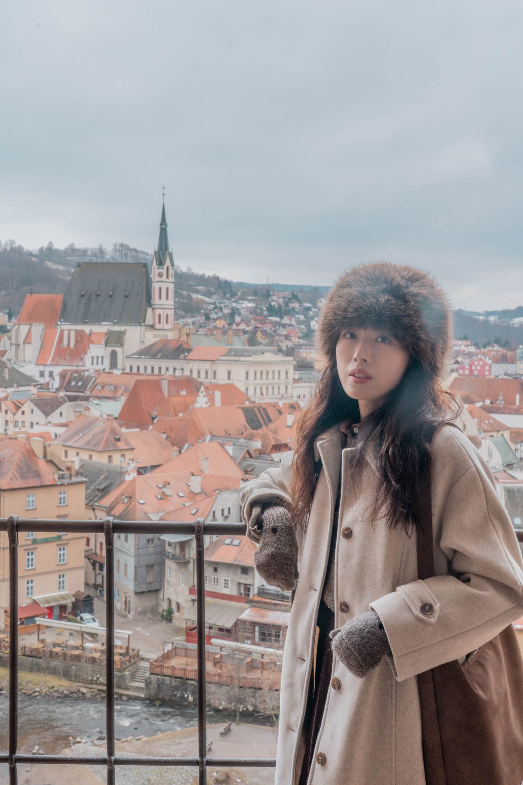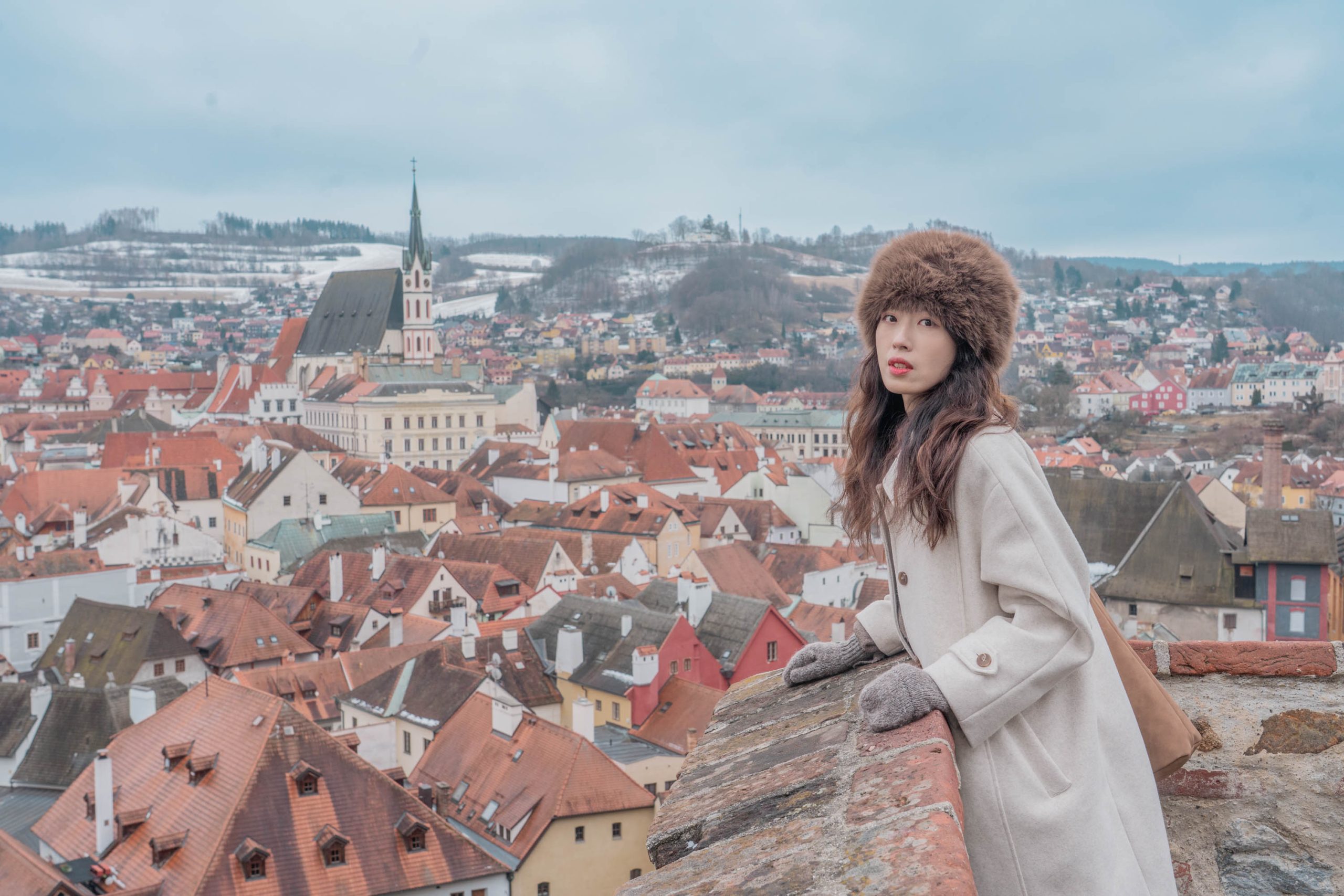 穿過橋面來到後方的觀景台,CK小鎮紅瓦屋頂、蜿蜒河流和遠處的聖維特大教堂尖塔一覽無遺,不需要講究構圖技巧,輕輕鬆鬆就能拍出滿意的人像照。
