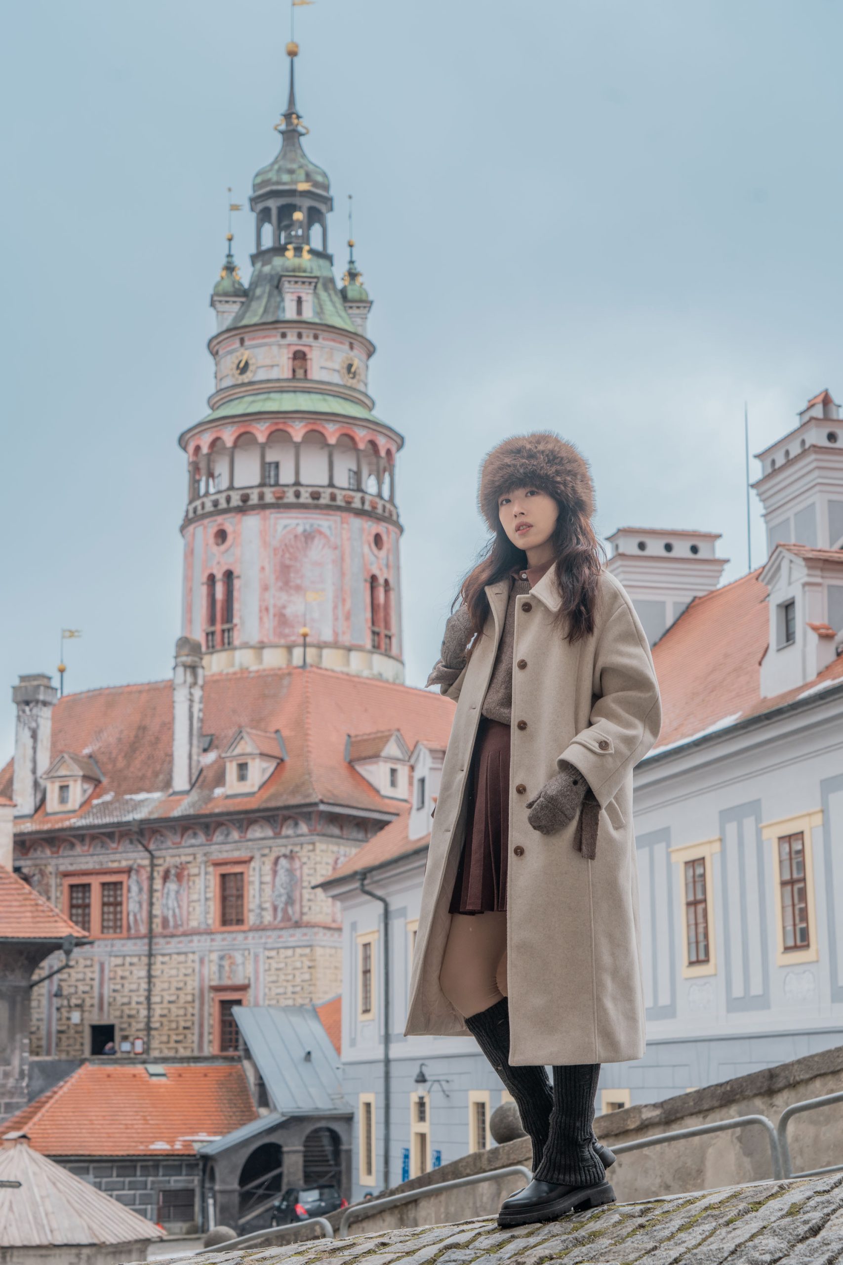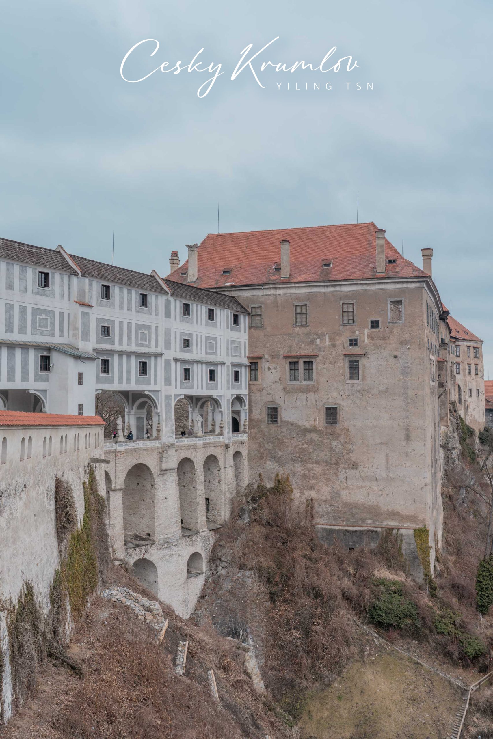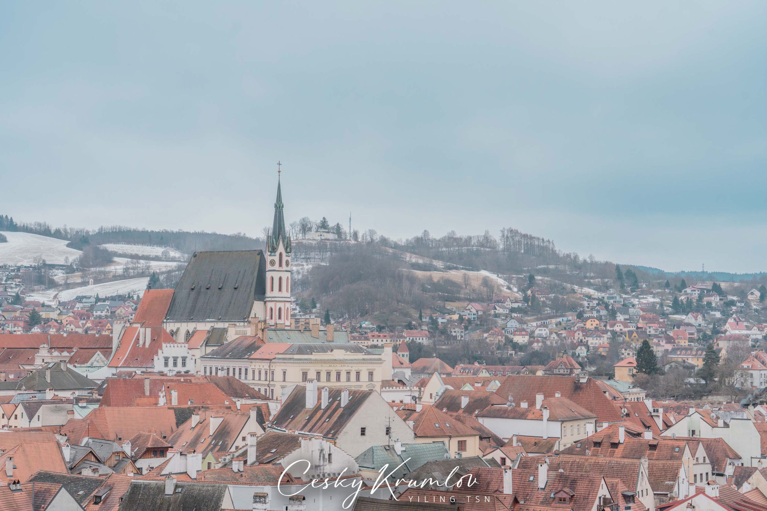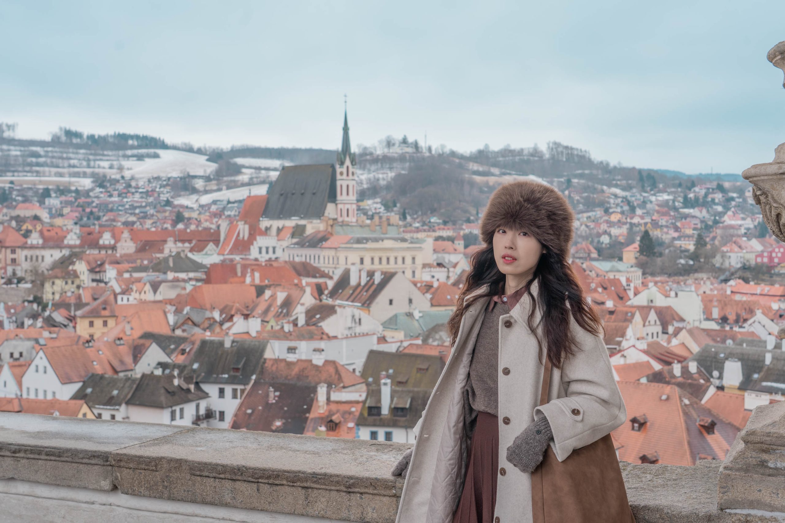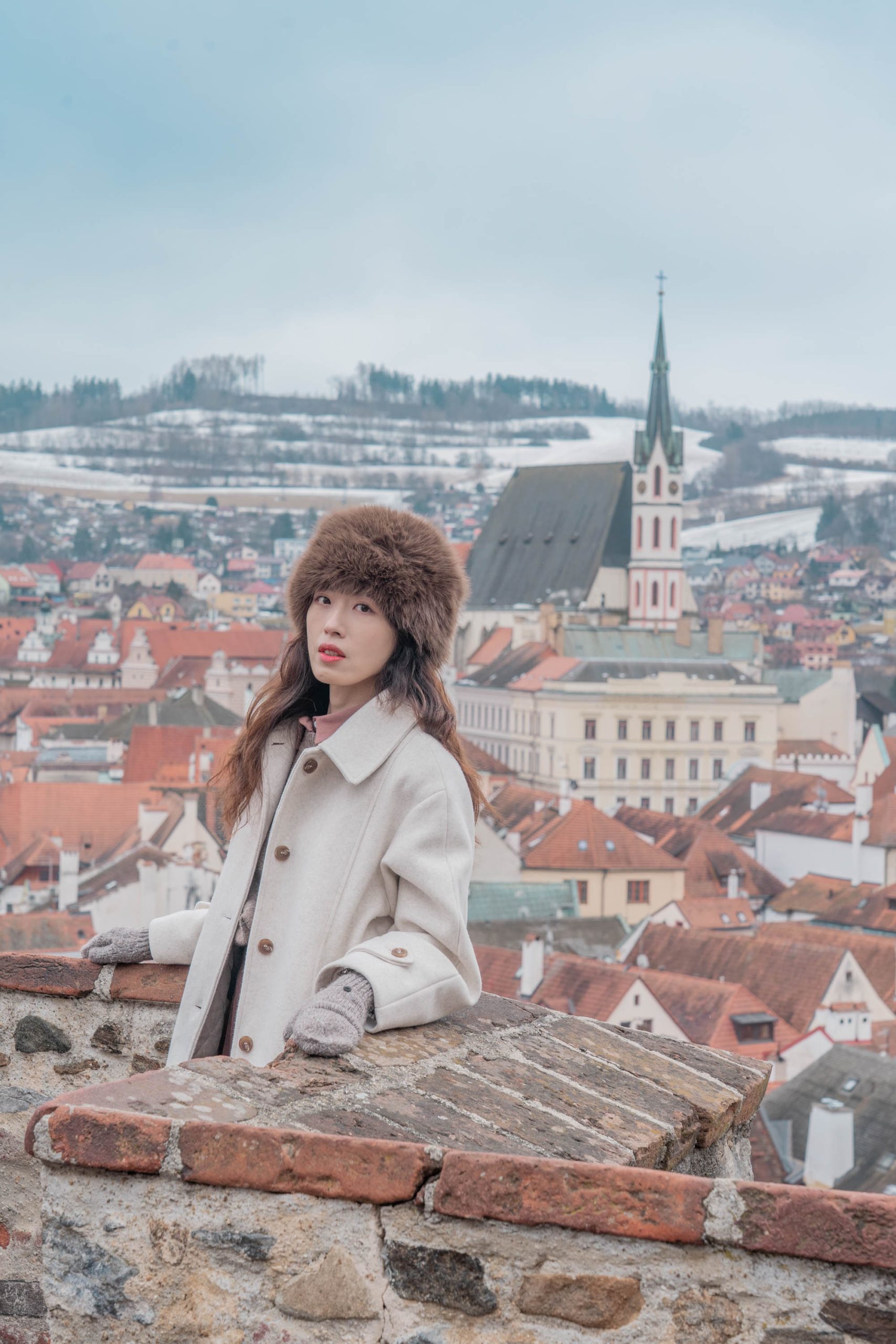 穿過橋面來到後方的觀景台,CK小鎮紅瓦屋頂、蜿蜒河流和遠處的聖維特大教堂尖塔一覽無遺,不需要講究構圖技巧,輕輕鬆鬆就能拍出滿意的人像照。