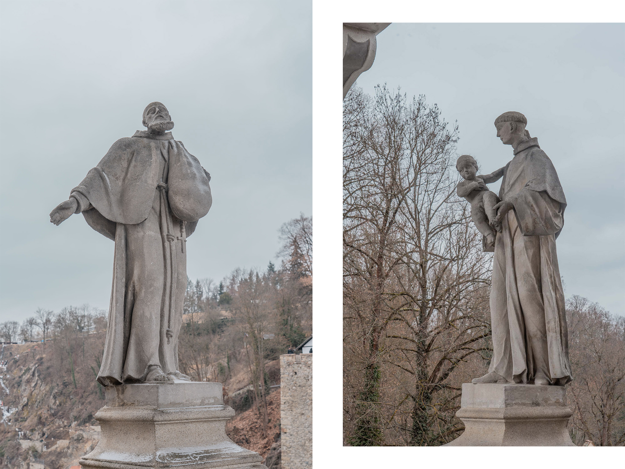 斗篷橋(Cloak Bridge)的歷史可以追溯到15世紀的木橋,如今氣勢磅礡的石造空中橋廊則是建於18世紀,矗立在巨大石柱上,兩側豎立著莊嚴的基督教聖人雕像。