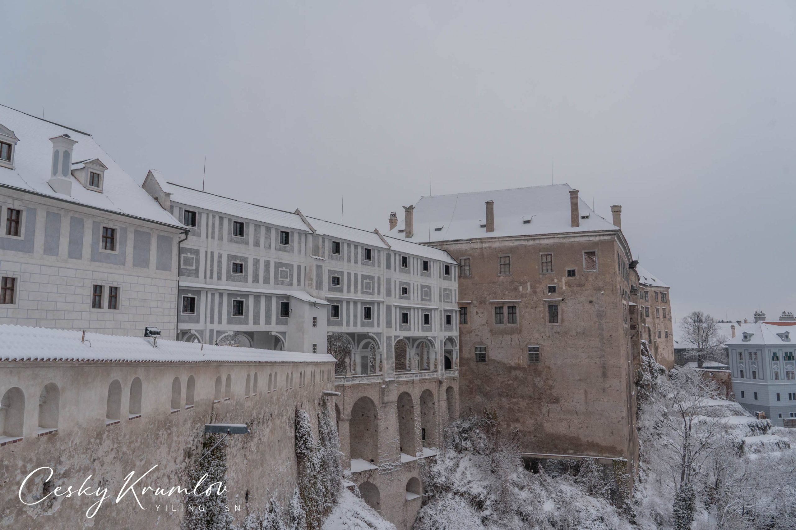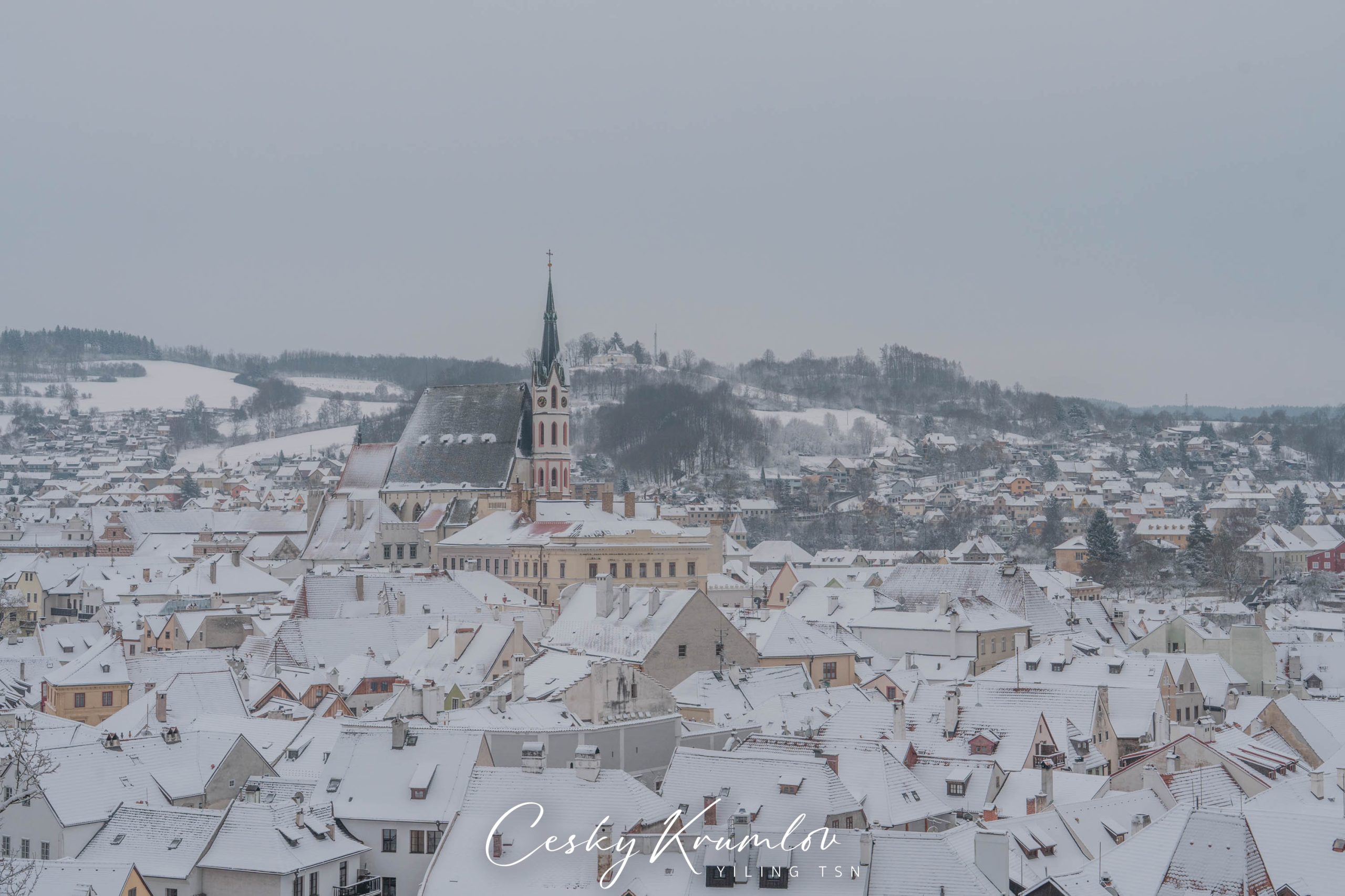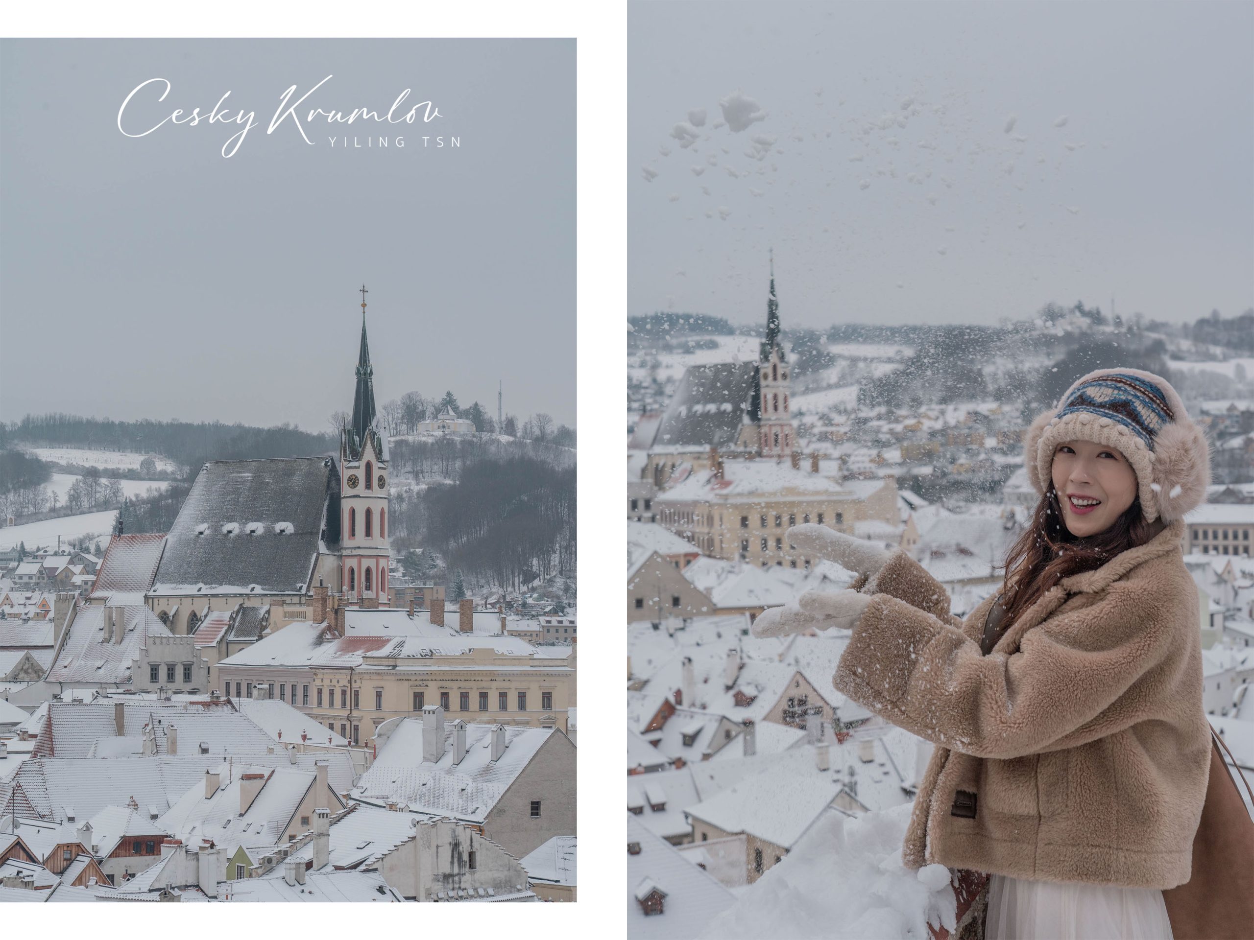 其實CK小鎮半天就能逛完,但為了接續前往奧地利哈修塔特的行程,我們庫倫諾夫住宿Pension MONO度過一晚。沒想到夜裡下了一場大雪,隔天清晨再訪城堡同一個觀景台時,原本溫暖飽滿的橘紅景致,一夜之間變身成連綿起伏的純白屋頂,就像是走進了一顆靜謐的雪花水晶球裡,夢幻得好不真實。