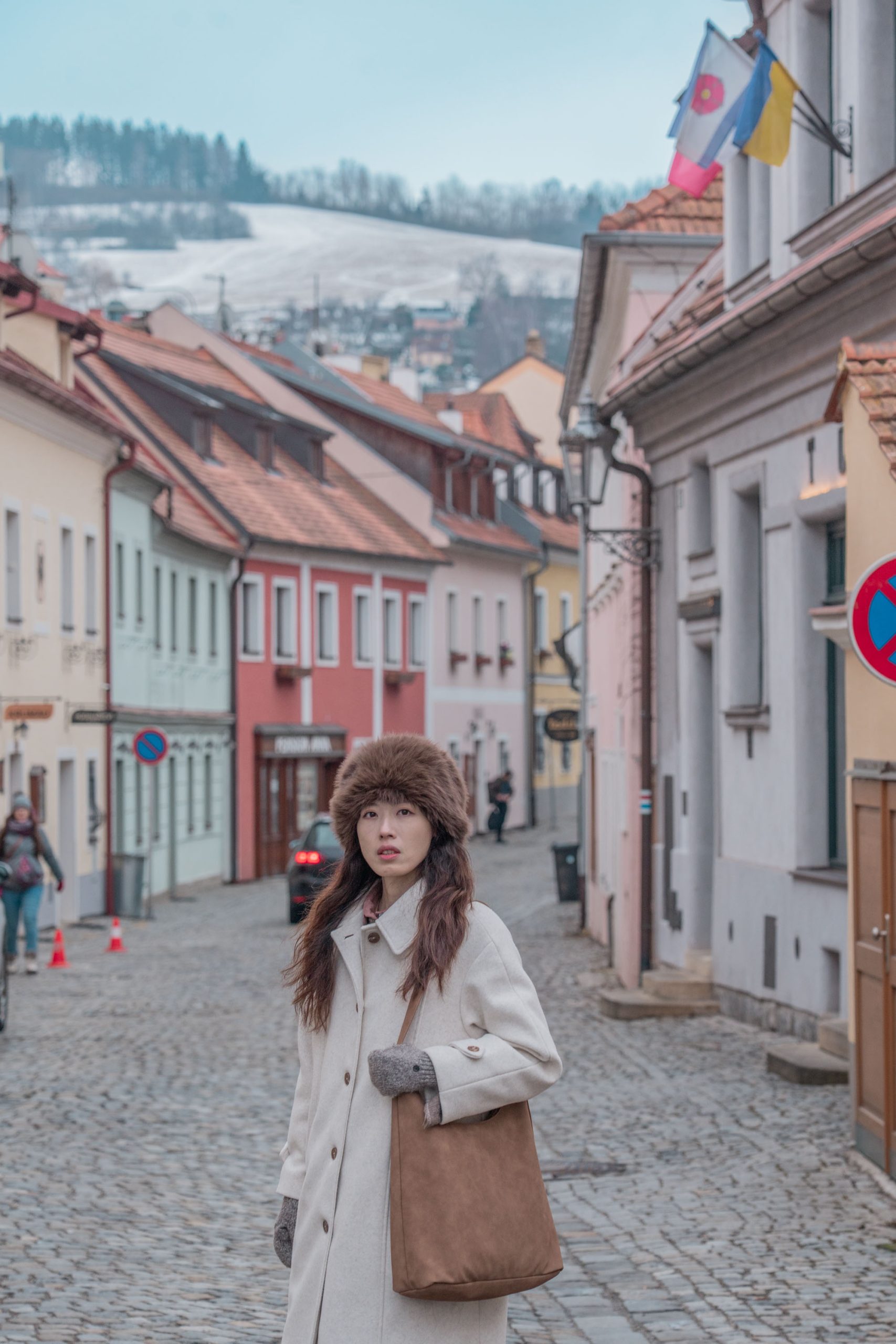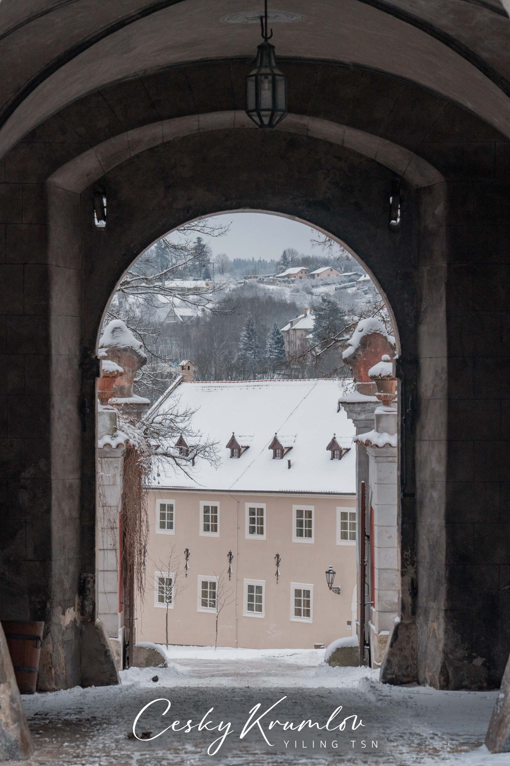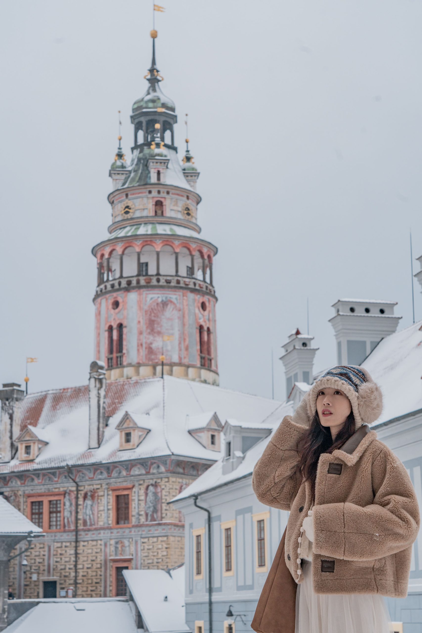 其實CK小鎮半天就能逛完,但為了接續前往奧地利哈修塔特的行程,我們庫倫諾夫住宿Pension MONO度過一晚。沒想到夜裡下了一場大雪,隔天清晨再訪城堡同一個觀景台時,原本溫暖飽滿的橘紅景致,一夜之間變身成連綿起伏的純白屋頂,就像是走進了一顆靜謐的雪花水晶球裡,夢幻得好不真實。