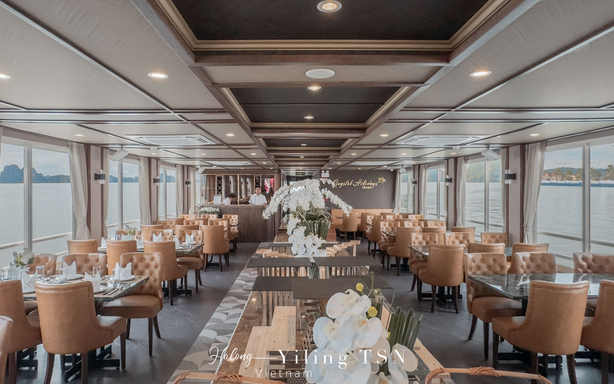 水晶假日號共有三層樓,一樓是舒適的室內用餐區,二樓設有按摩泳池和包廂,三樓則是開放甲板層,可以盡情欣賞海上風光。純白船身設計,散發濃濃度假氛圍,一上船就能感受到悠閒放鬆氣息。