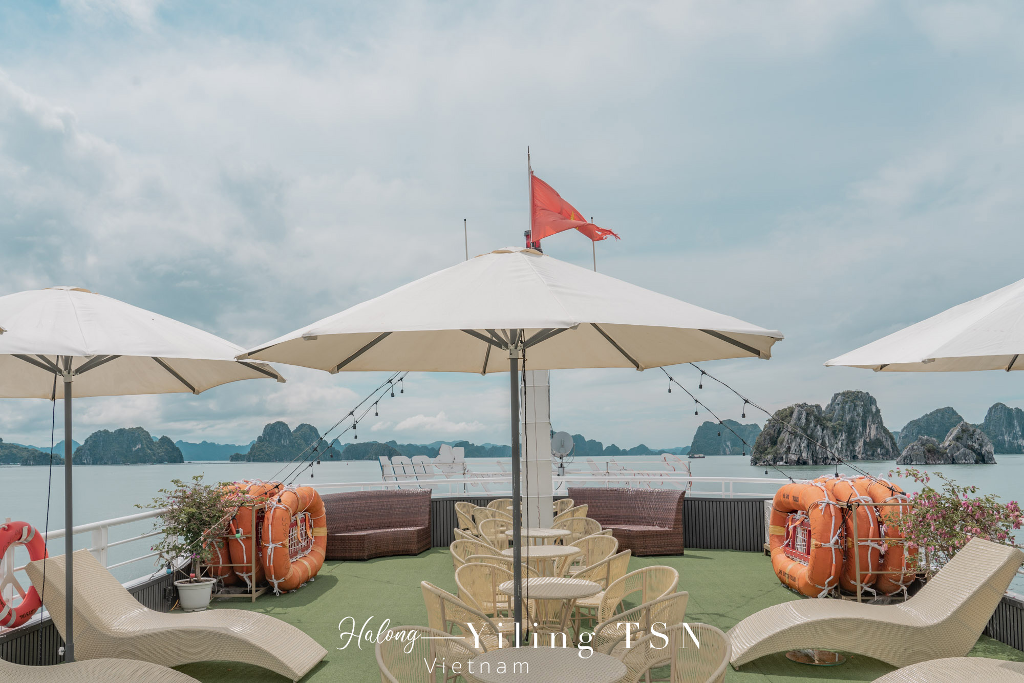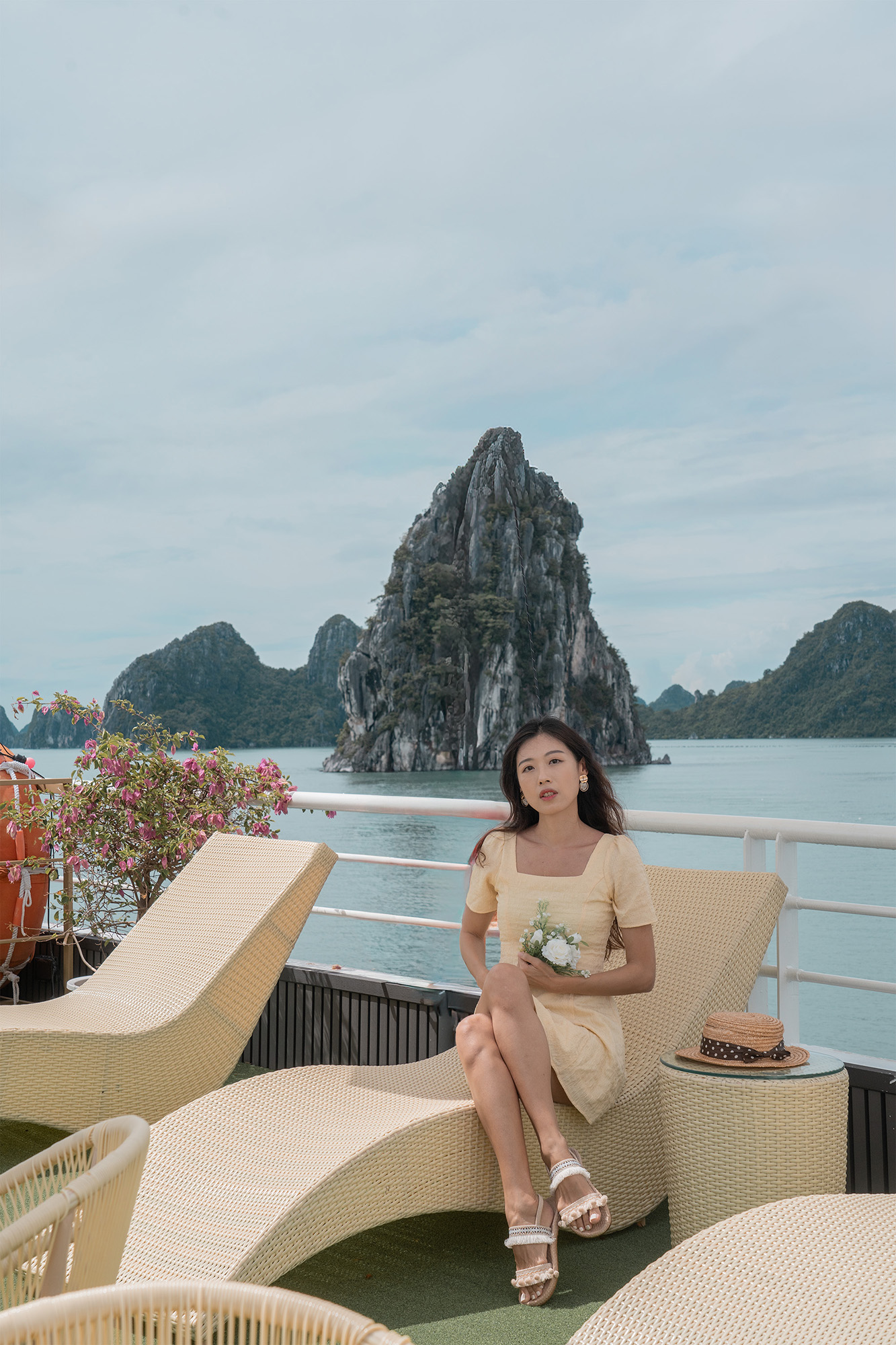 甲板層可以俯瞰拜子龍灣最獨特的景致,躺椅和陽傘採用明亮黃色調,剛好和我身上的洋裝配成套。