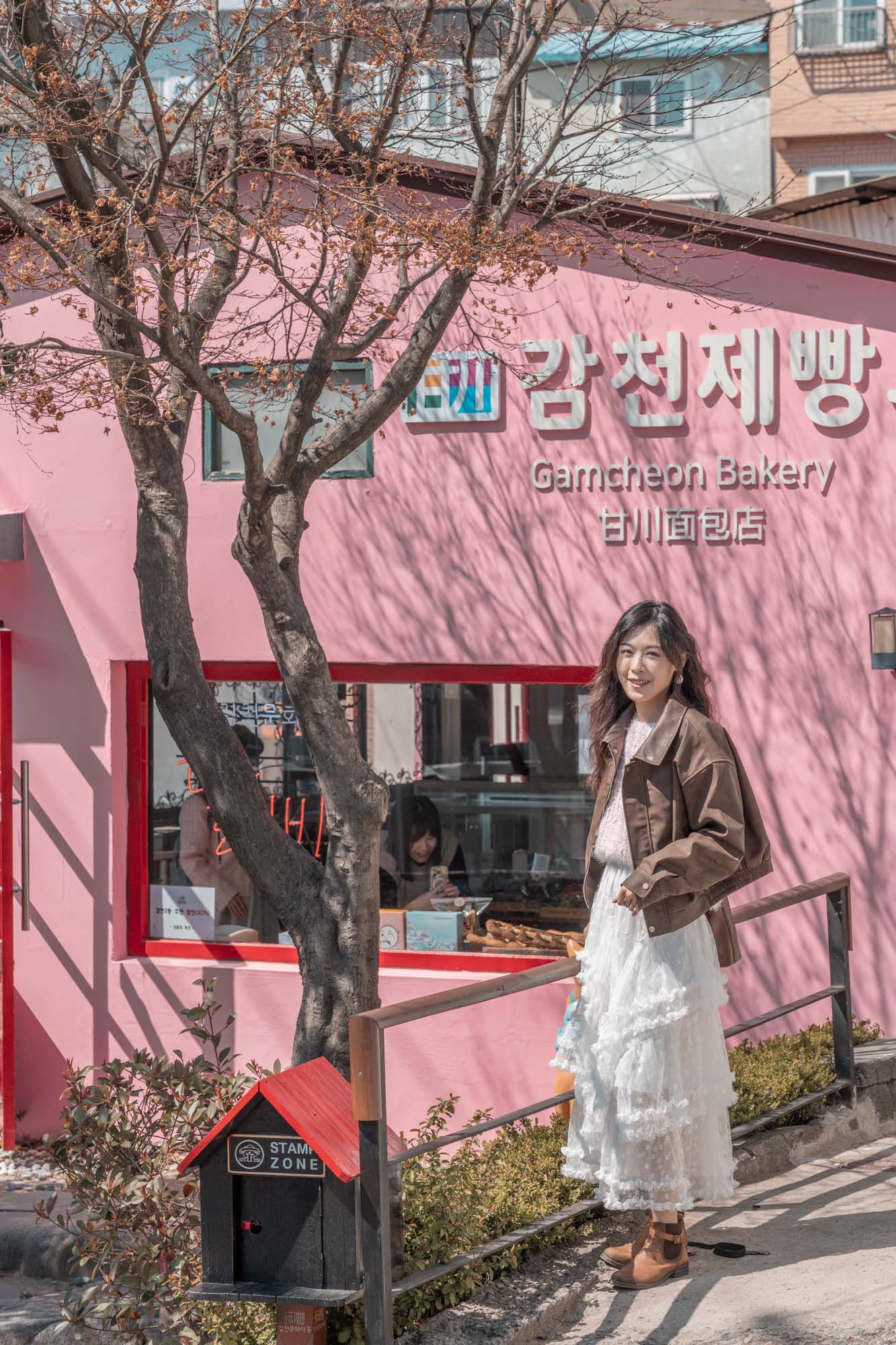 甘川麵包店在官方集章地圖上也有特別介紹,可愛角色外觀非常吸引人,其中店家招牌就是圓圓的月亮蛋糕,有提供多種口味。因為這幾天入住的釜山住宿早餐麵包實在太不可口,旅伴特別分送我一塊小蛋糕,口感口味我覺得還不賴。