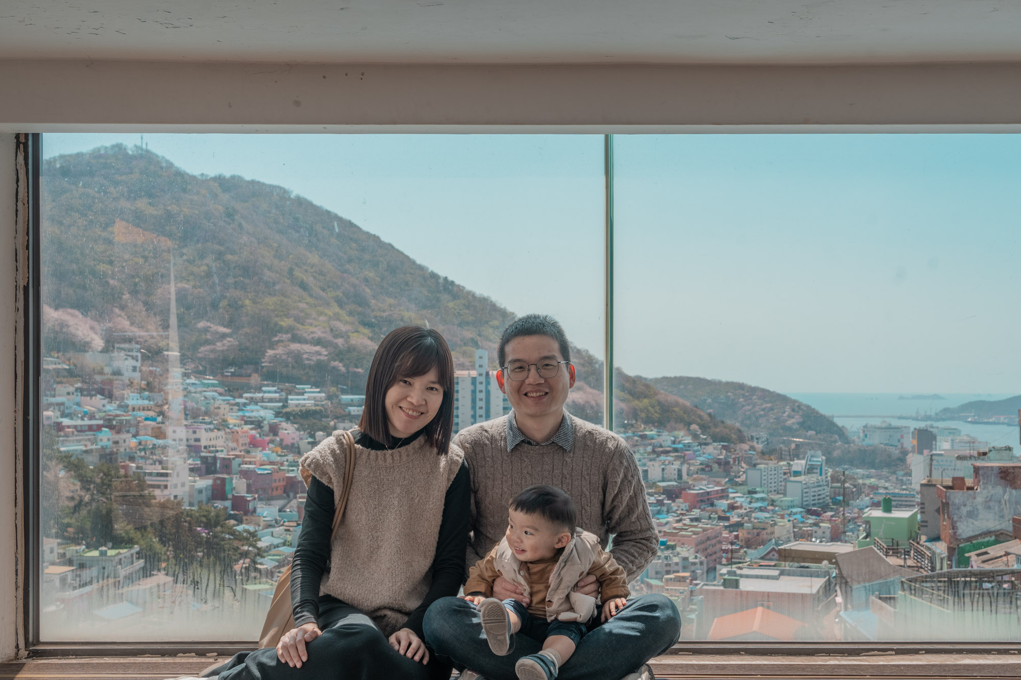 一旁的平台除了能拍到小王子和狐狸正面照之外,透明玻璃窗也能眺望甘川洞文化村,結果拍完這張之後姪兒就摔跤撞到頭,我的假掰照只能下次再來補考了我哭!