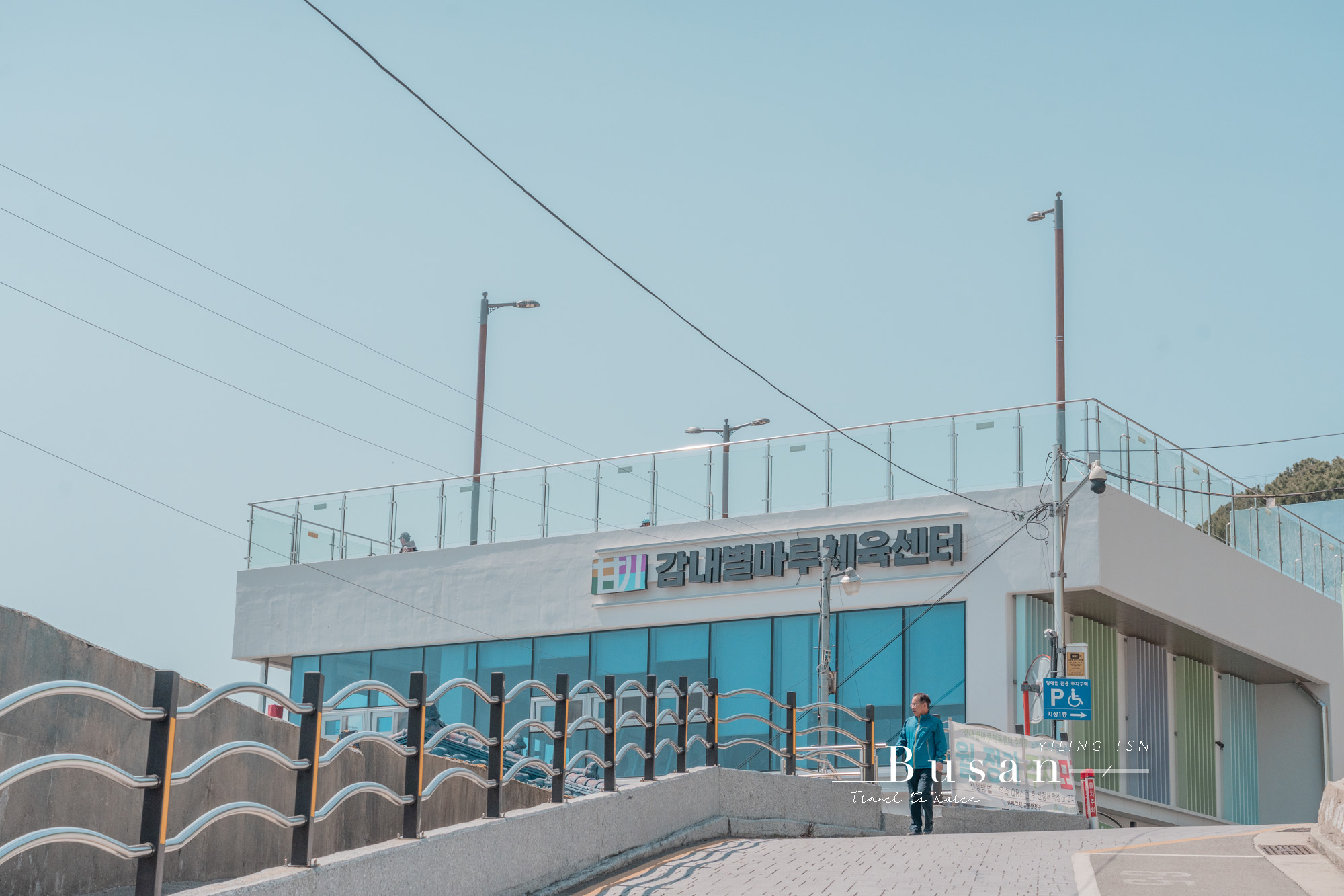 天空觀景台建築保存了居民原始小屋外觀,內部室內展示著甘川洞文化村相關資訊,不過大家更有興趣的則是來到露台欣賞景色,鋪上綠色草坪造景和白色欄杆,眺望遠方海景,視野非常棒。