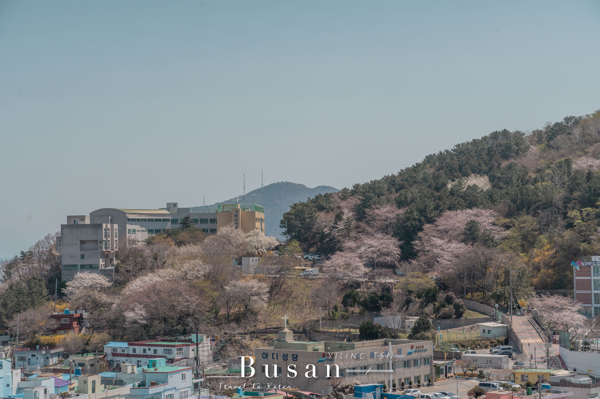 經過BTS壁畫牆後,就換見到「I Love Gamcheon」招牌,最適合留下一張觀光客到此一遊照。從這兒也能眺望風景,遠處有一棟教堂,我總覺得鮮豔藍黃配色很有IKEA風格。