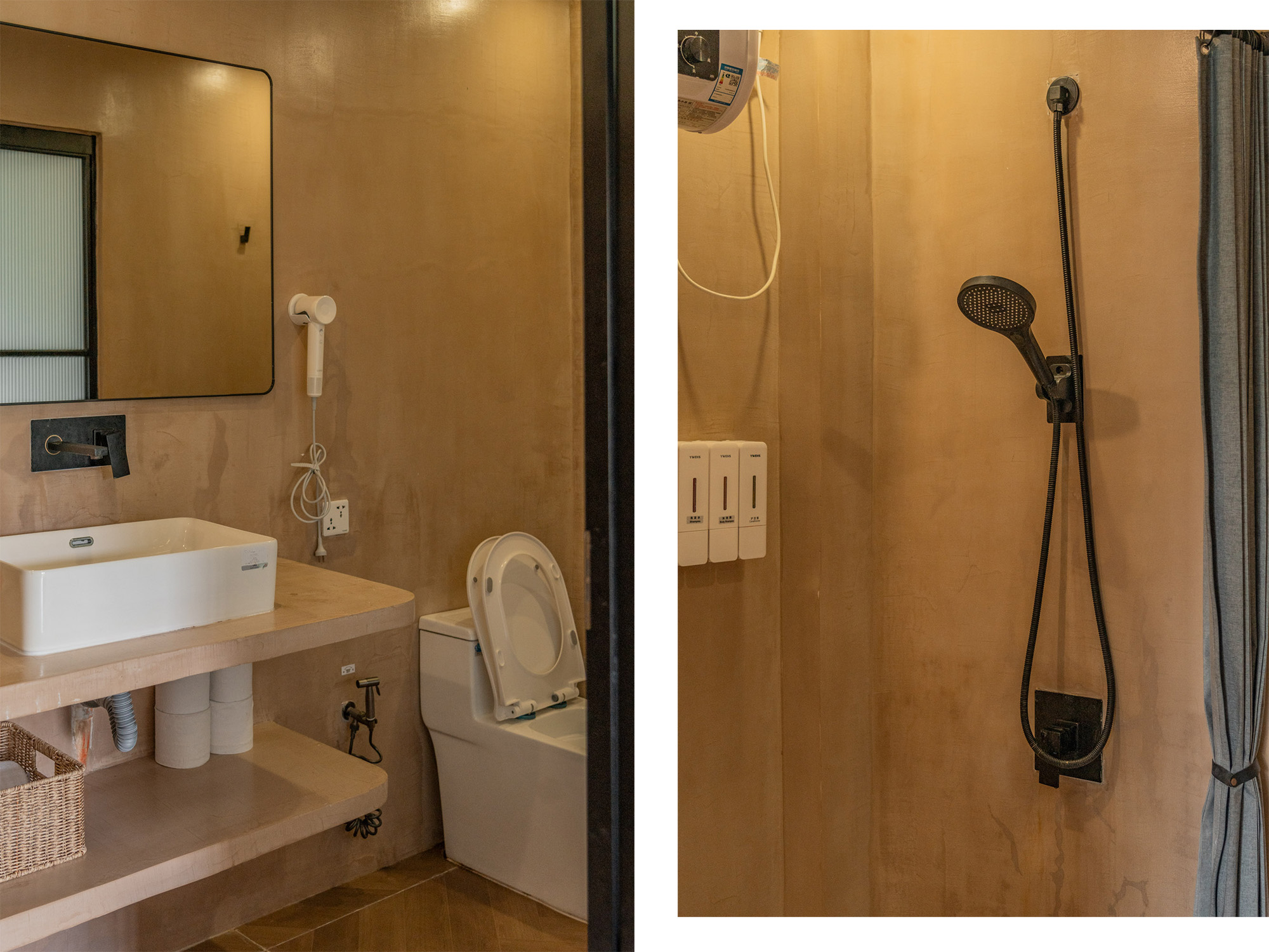 乾濕分離淋浴間設計,提供毛巾和浴巾,洗髮精潤髮乳都是選用大瓶裝,並搭配香皂和洗手乳。不提供拋棄式牙膏牙刷,小小提醒一下需要自備,這點我覺得很棒,一起環保愛地球!對了對了,房內也沒有瓶裝礦泉水,不過都可以拿著杯子到餐廳裝取冷熱水飲用。