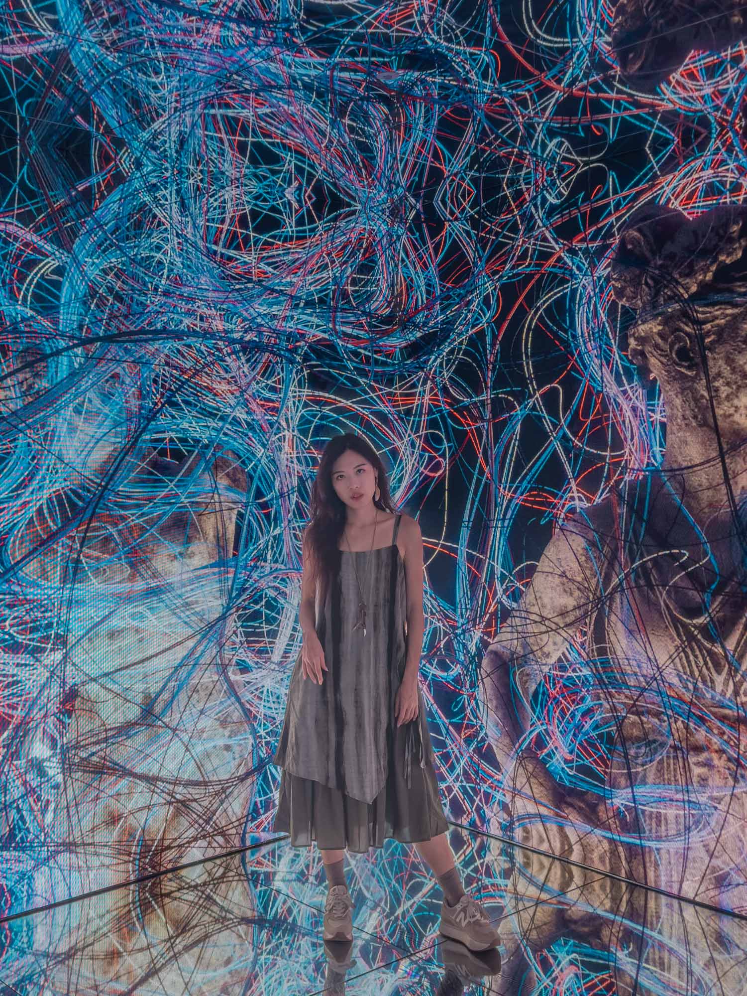 二樓幾個展間也有精彩的作品,其中休息區以鏡面投影很有teamLab的風格。《Time of Resonance》以古老雕塑和錯綜複雜的線條象徵時間流逝,這區我覺得也蠻好拍的。