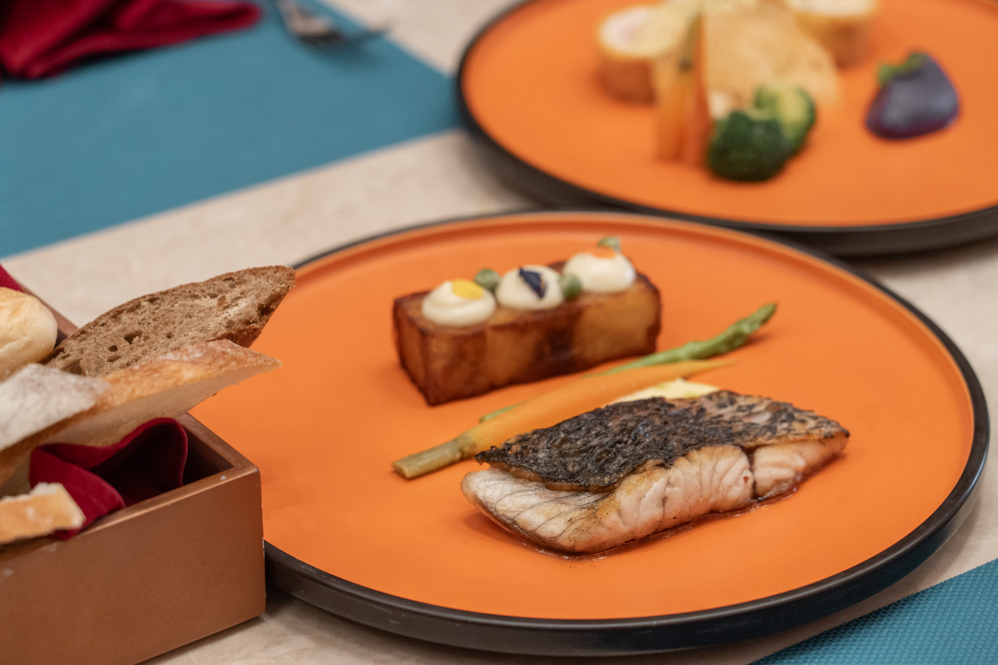開胃菜是清爽脆口的悅椿凱撒沙拉,搭配濃郁滑順的奶香南瓜杏仁濃湯,主菜是海陸擇一,我選擇了奶油檸檬嫩煎鱸魚,有著高水準的西餐表現。