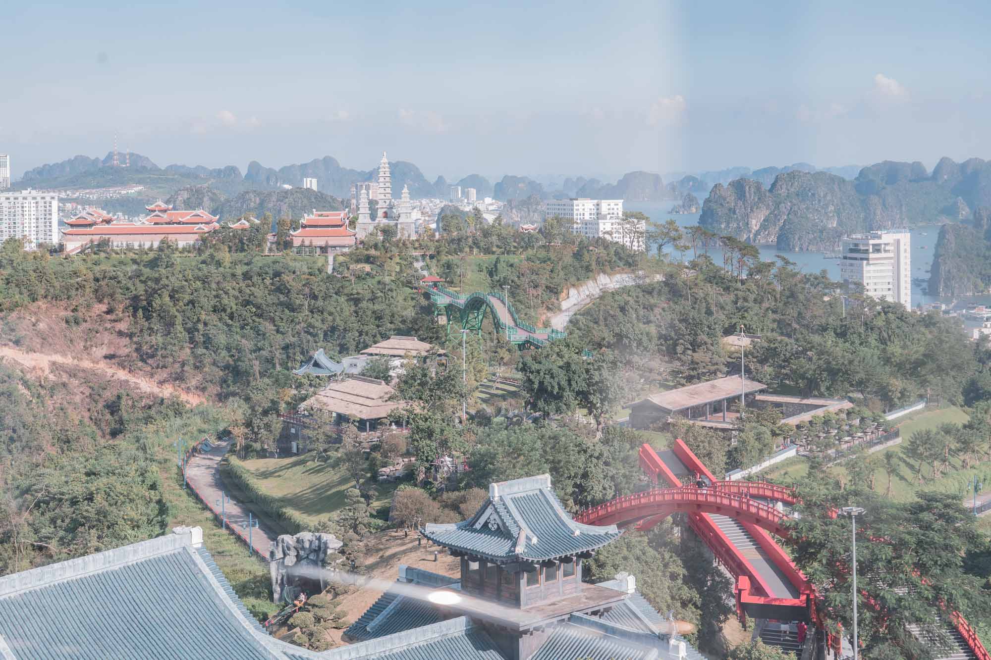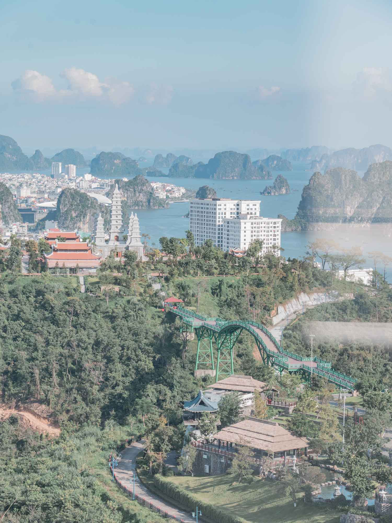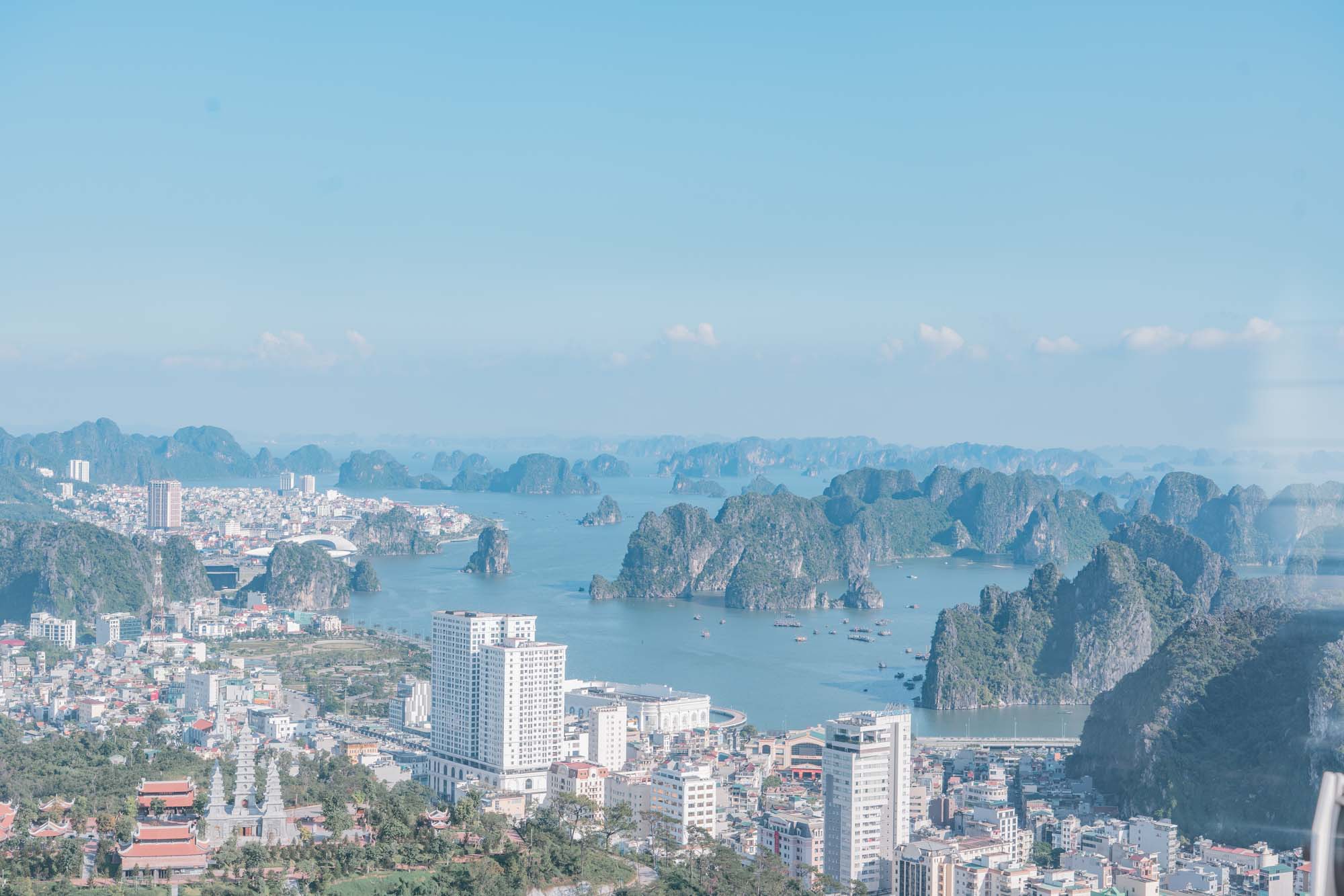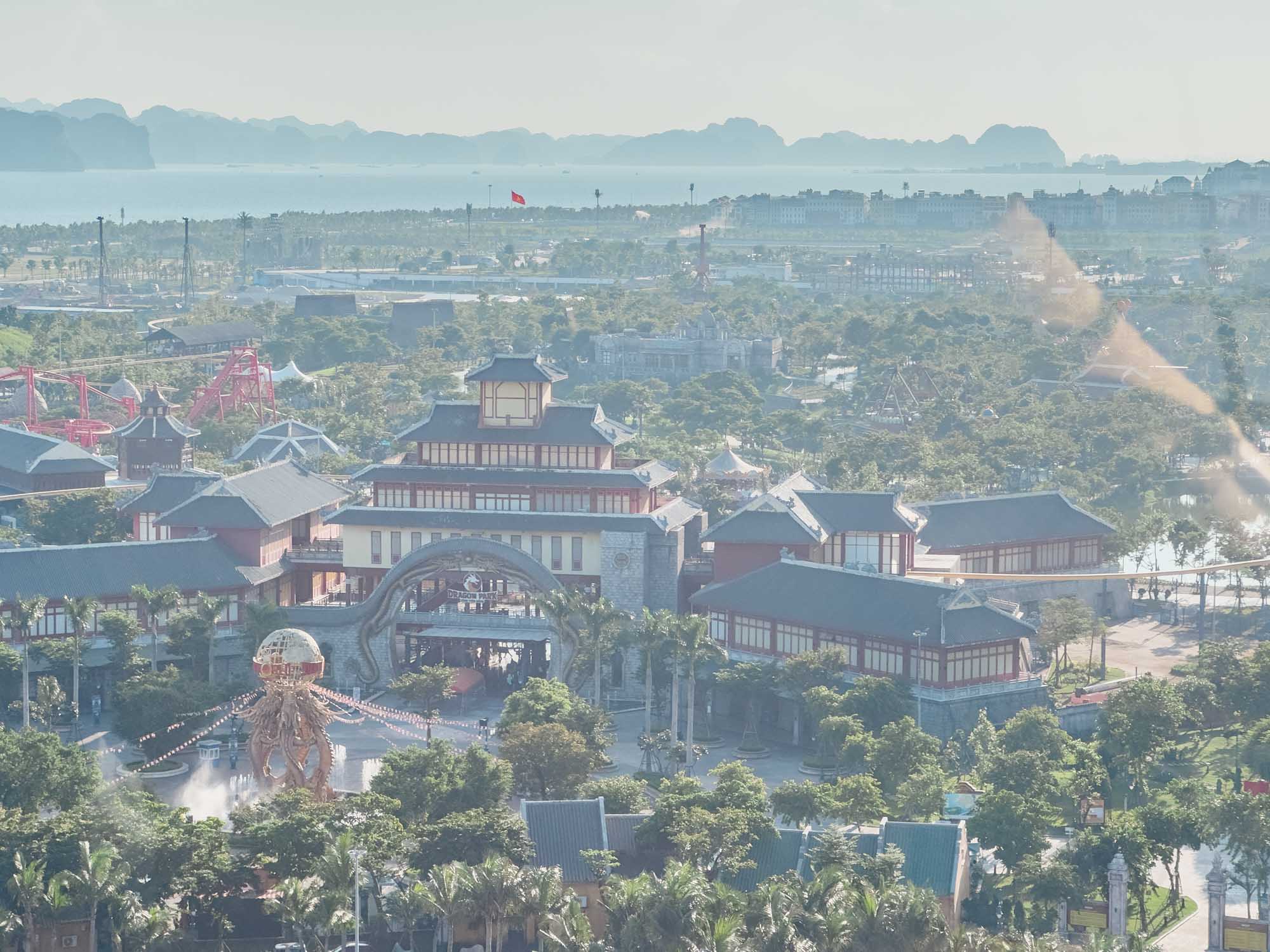 纜車橫跨壯闊的下龍灣海域,整片下龍灣石灰岩山水景致盡收眼底,遠方的太陽之眼摩天輪也清晰可見。