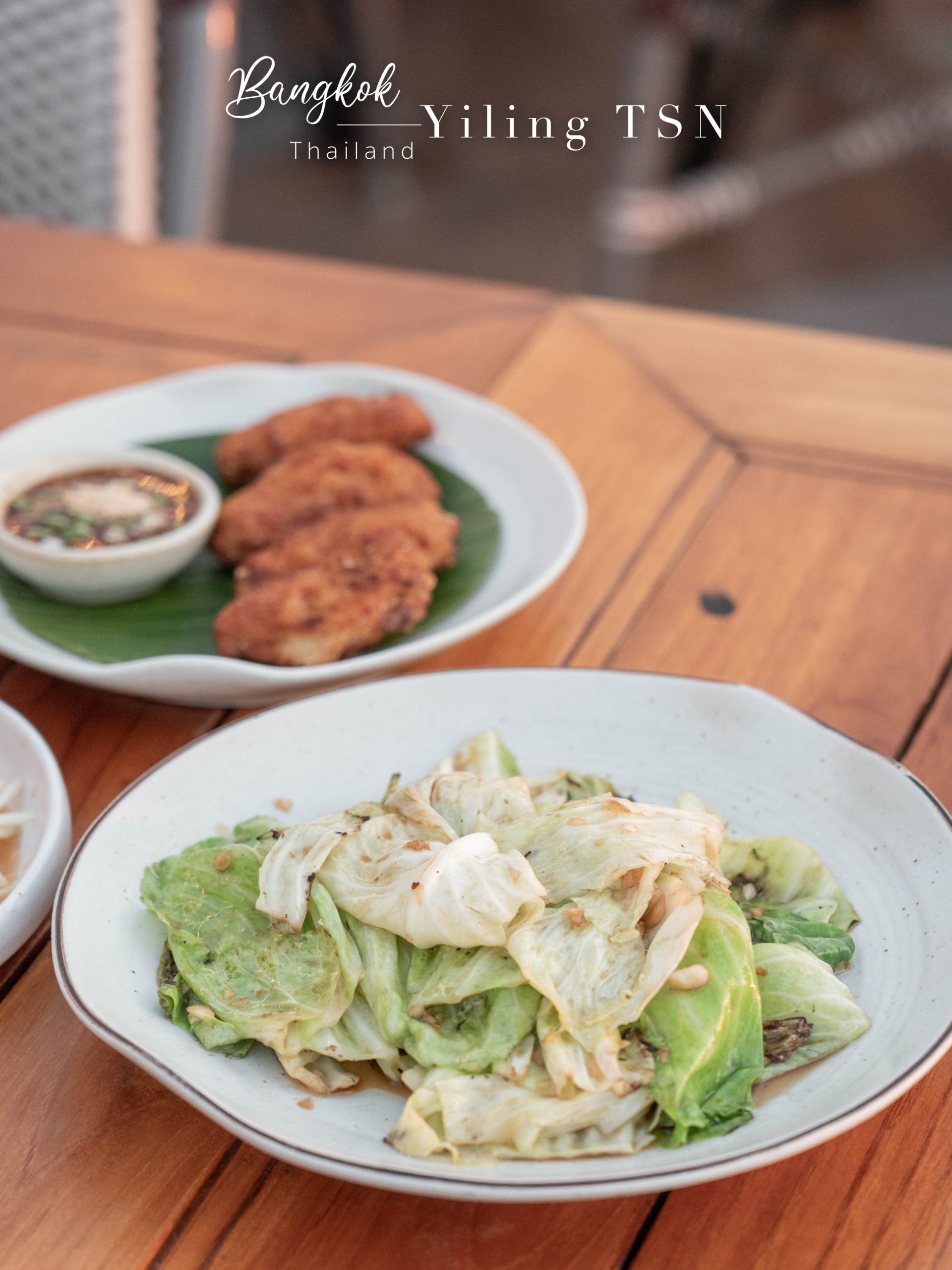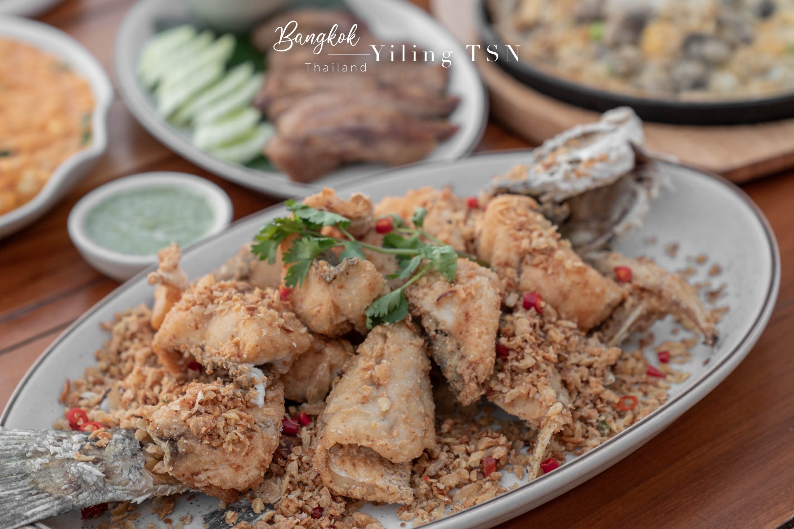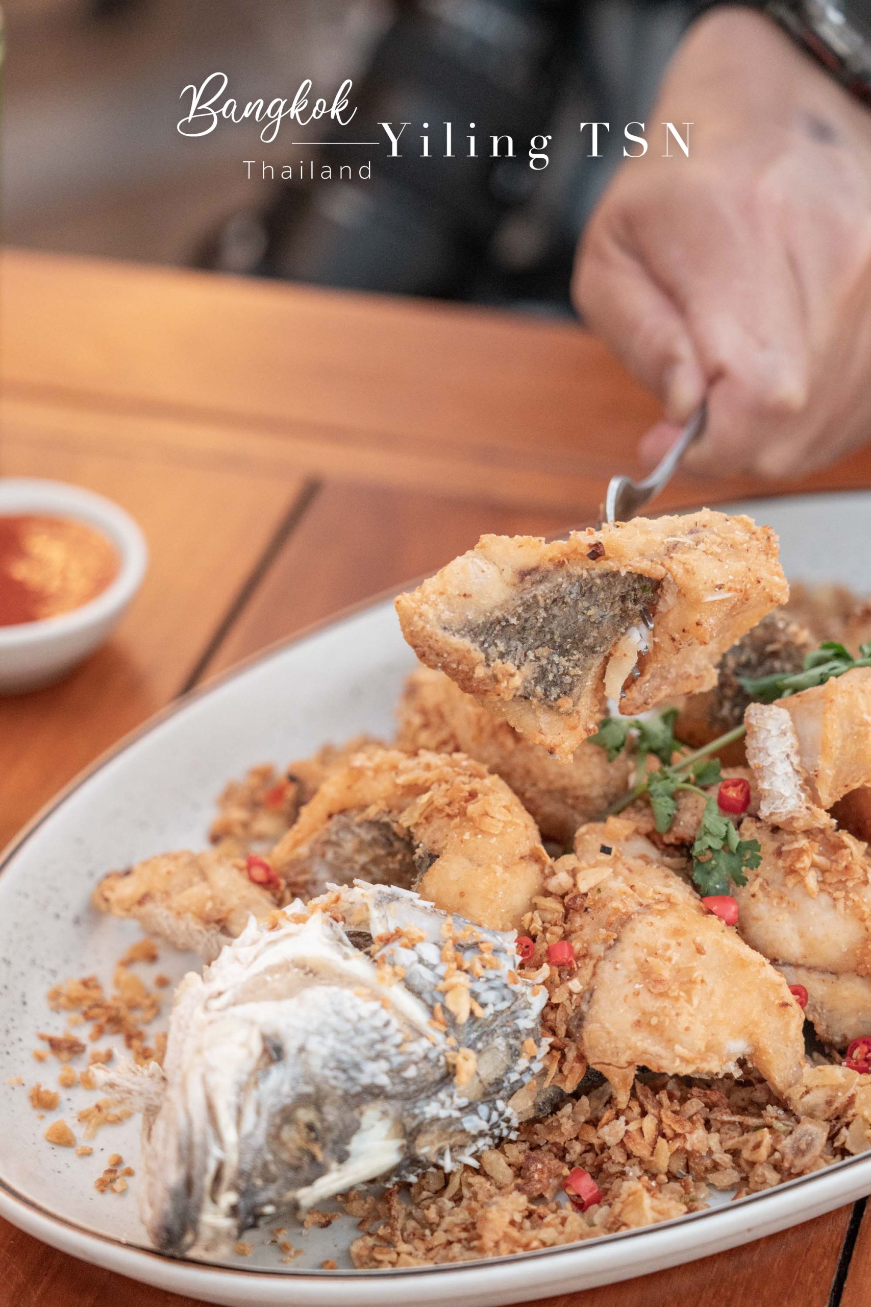 有別於泰式料理中常見的檸檬魚做法,將鱸魚調味後炸酥炸,表皮金黃酥脆,內部魚肉依然細嫩,每口都能聽見卡滋卡滋的聲響,搭配辣椒和蒜酥,鹹香中帶點微辣,口感層次非常豐富。