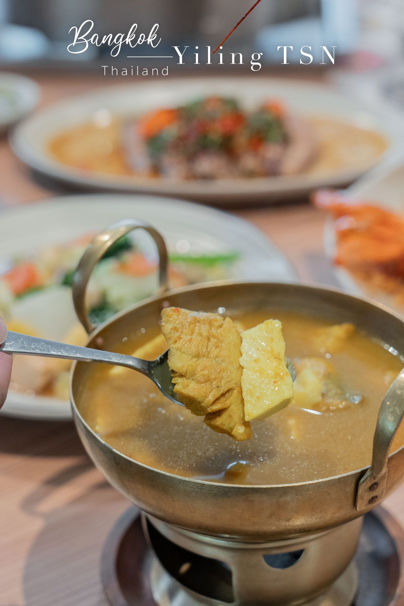 季節限定的泰南黃咖哩,金黃色的湯頭濃郁酸辣,帶著豐富的香料層次,搭配口感爽脆的半天筍和鮮嫩鱸魚,風味強烈獨特。