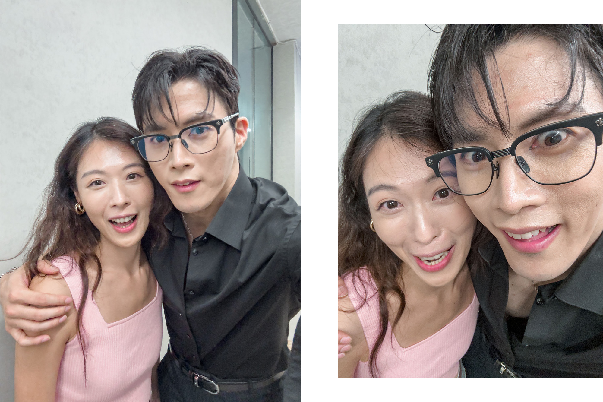 我本來不愛男生長髮造型,不過演出時被這位猛男的精緻五官給迷住了,而且還很有誠意來我前方跳完一整段,拉著我的手狂摸屁屁,當然下班路一定要找你來張合照,看看這張我們根本超搭呀自己說哈哈哈!